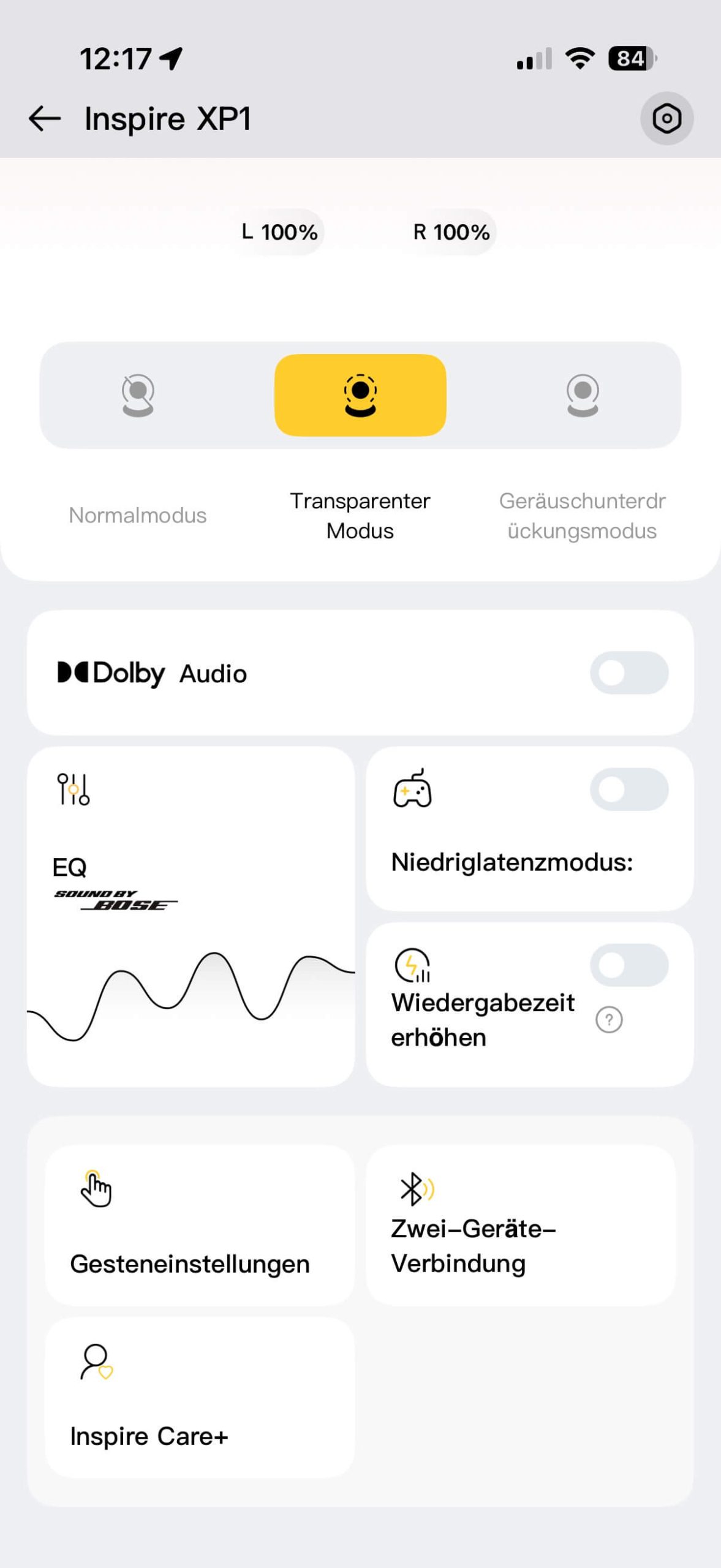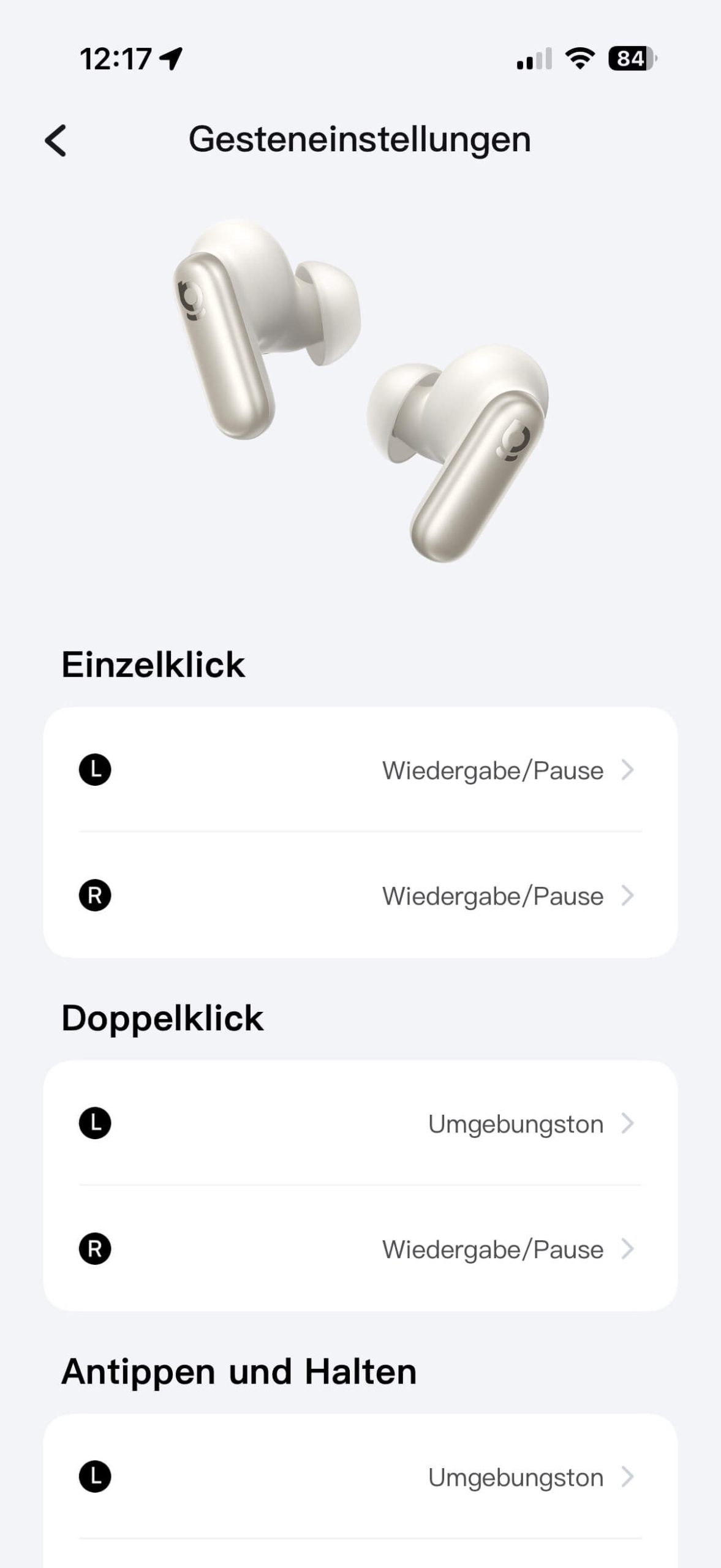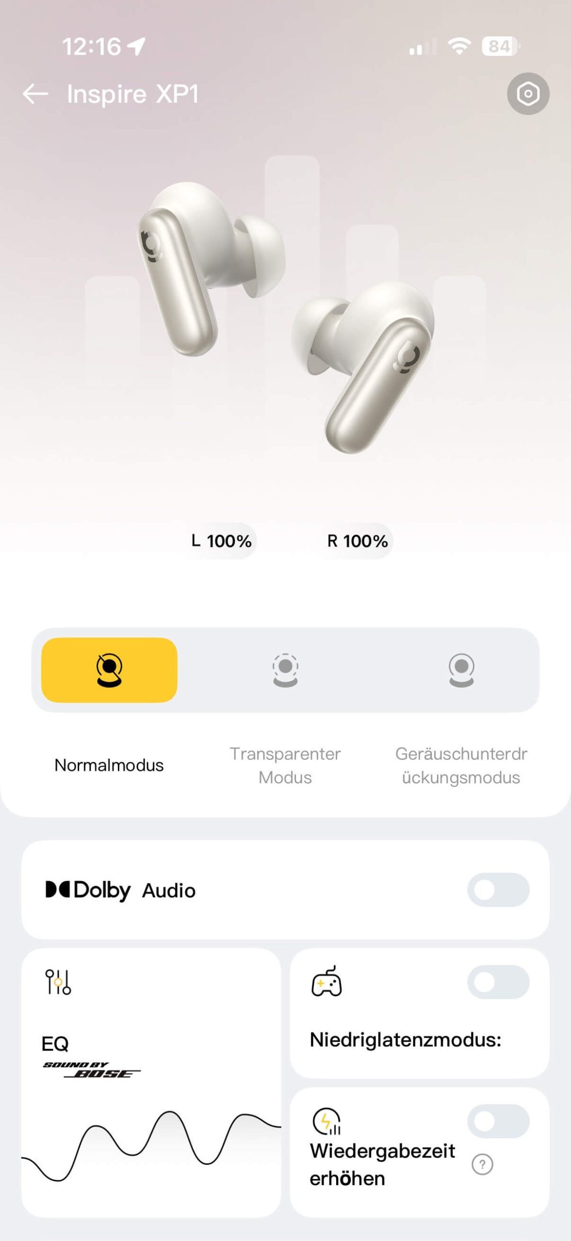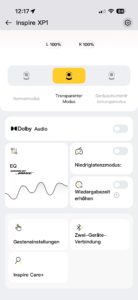 Die Baseus-App bietet beim XP1 einen erfreulich großen Funktionsumfang. Neben Firmware-Updates und dem Aktivieren von Dolby Audio gibt es einen Equalizer mit verschiedenen Presets sowie die Möglichkeit, eigene Klangprofile zu erstellen. Darüber hinaus lassen sich die Gestensteuerungen individuell anpassen – etwa Doppeltipp für Titel vor/zurück, Dreifachtipp für Sprachassistenz oder ANC-Umschaltung.