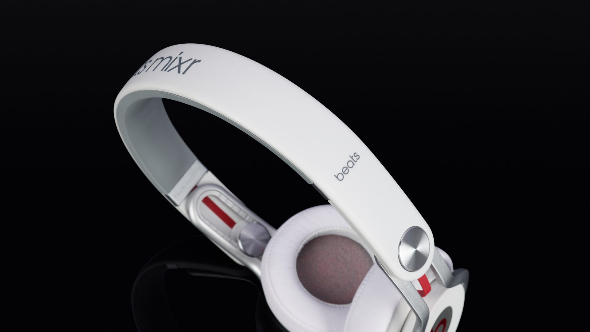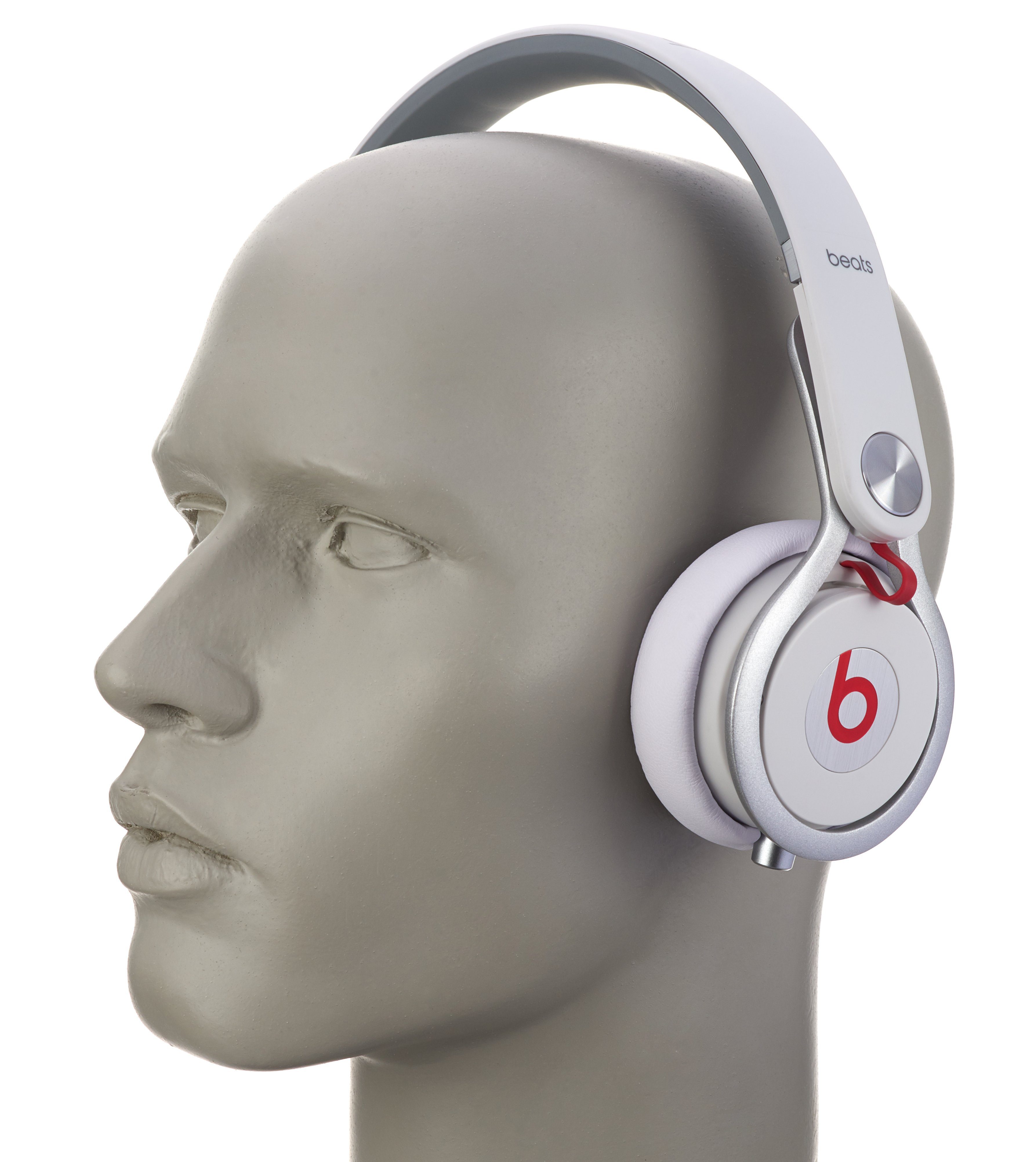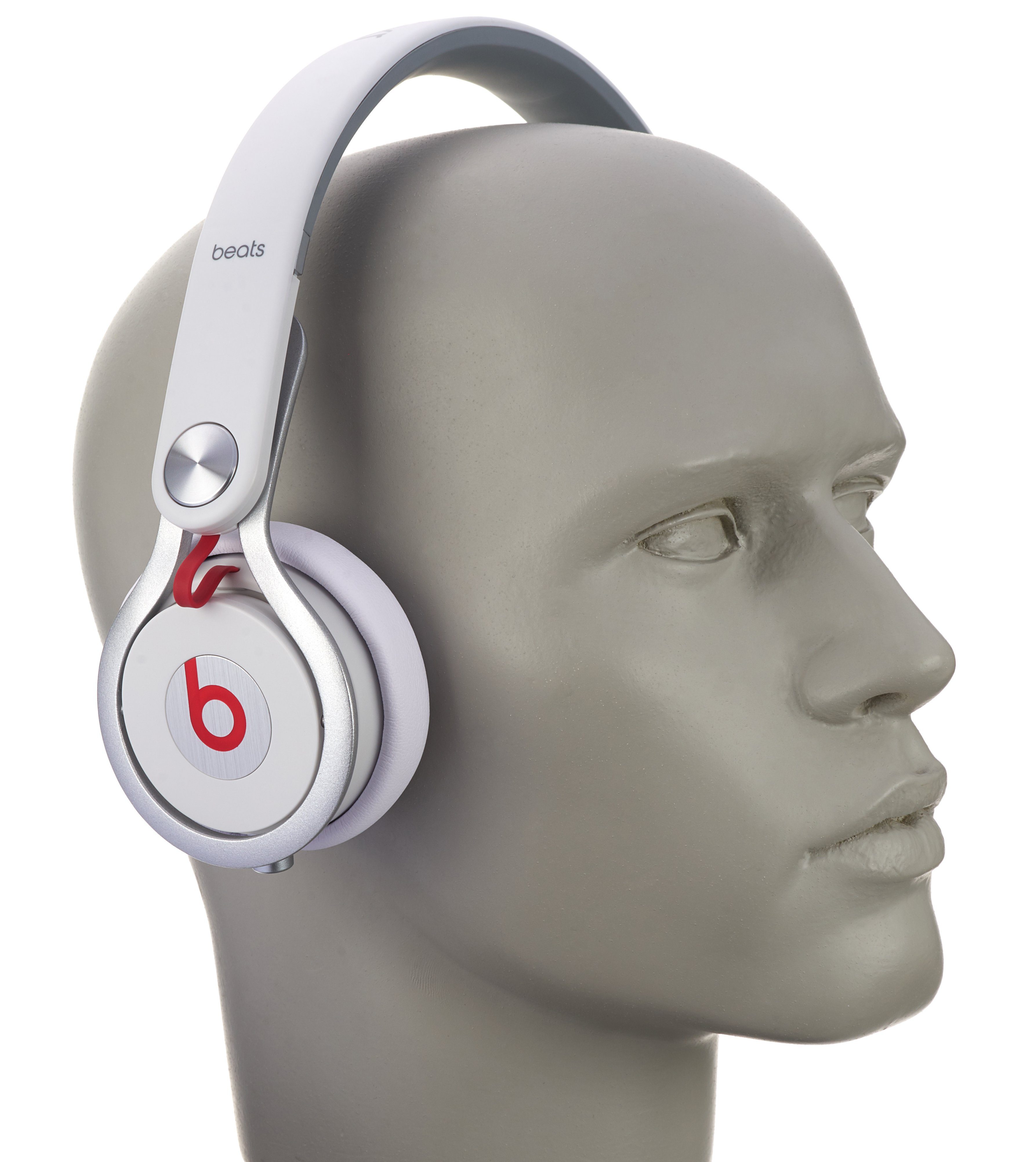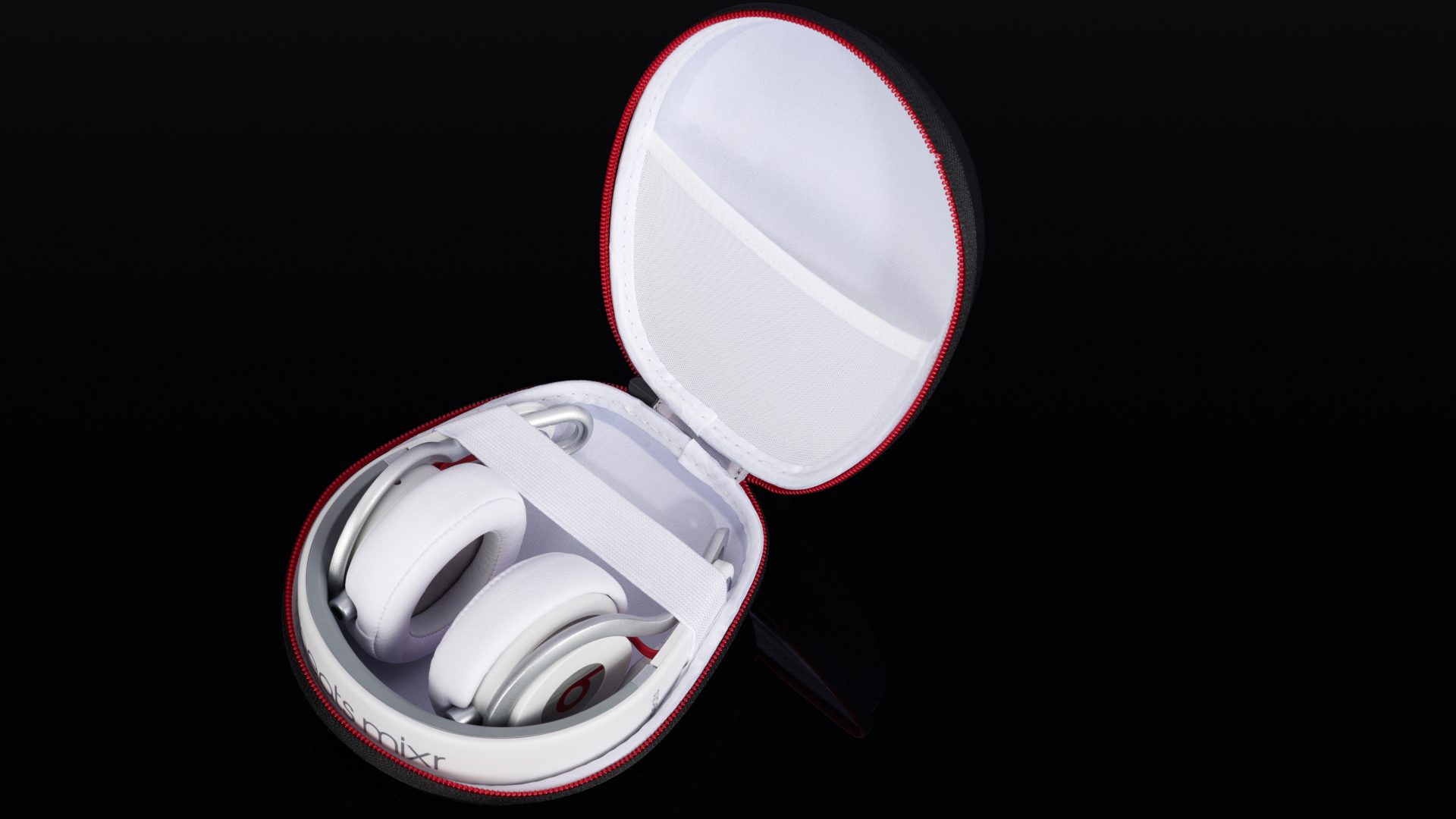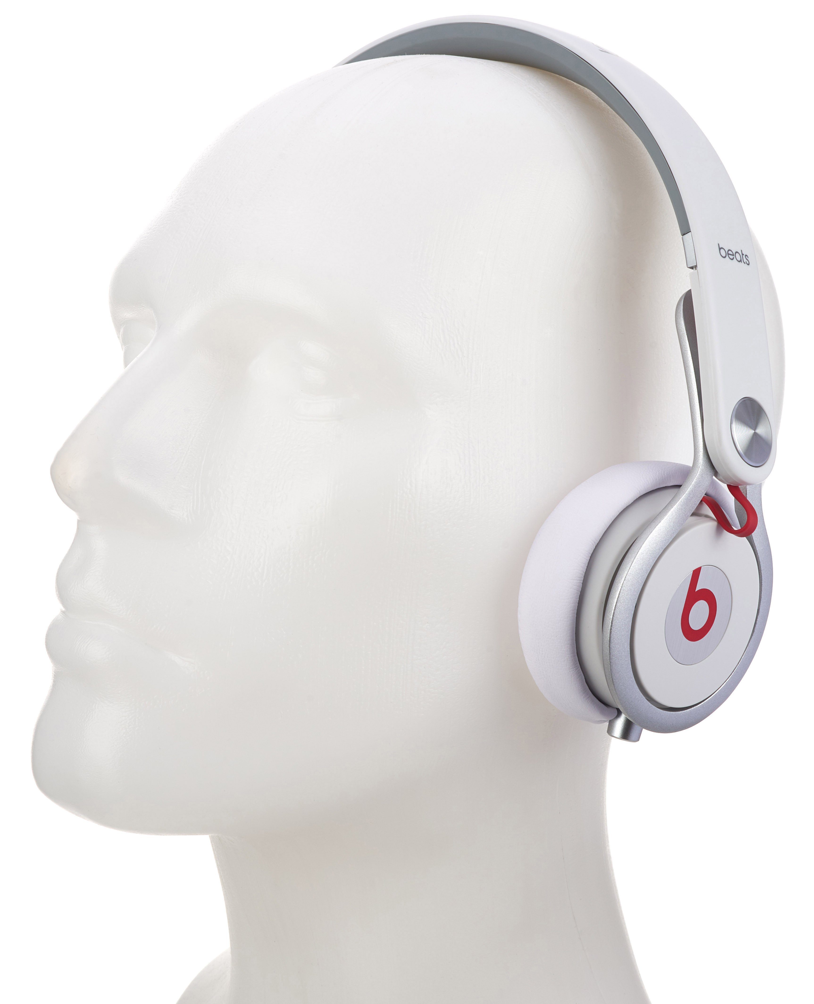 Beats by Dr. Dre präsentiert mit seinem Mixr einen sehr stylischen und technisch auf die Bedürfnisse des DJs angepassten Kopfhörer. Sein Design fällt auf und wirkt recht hochwertig. Matte Metalloberflächen der Ohrkapseln und kleine geprägte Metallapplikationen in der Bügelinnenseite polieren die robuste und 210 Gramm leichte Hartkunststoffkonstruktion des Kopfhörers auf. Der Bügel passt sich der Kopfform durch hohe Spannkraft druckvoll an. Obwohl die Schaumstoffpolsterungen an der Bügelunterseite und der Muscheln den Druck zwar kompensieren, leidet der Tragekomfort etwas darunter. Drehgelenke aus Metall erlauben das Umklappen beider Muscheln um 270 Grad. Um die Stellung auch bei heftigeren Kopfbewegungen zu halten, rasten der Winkel und auch die Höhe der Kapseln in verschiedenen Stufen der Aufhängung ein. Allerdings drückt die gedrehte Muschelaufhängung mit zunehmendem Winkel unangenehm auf den Kopf.