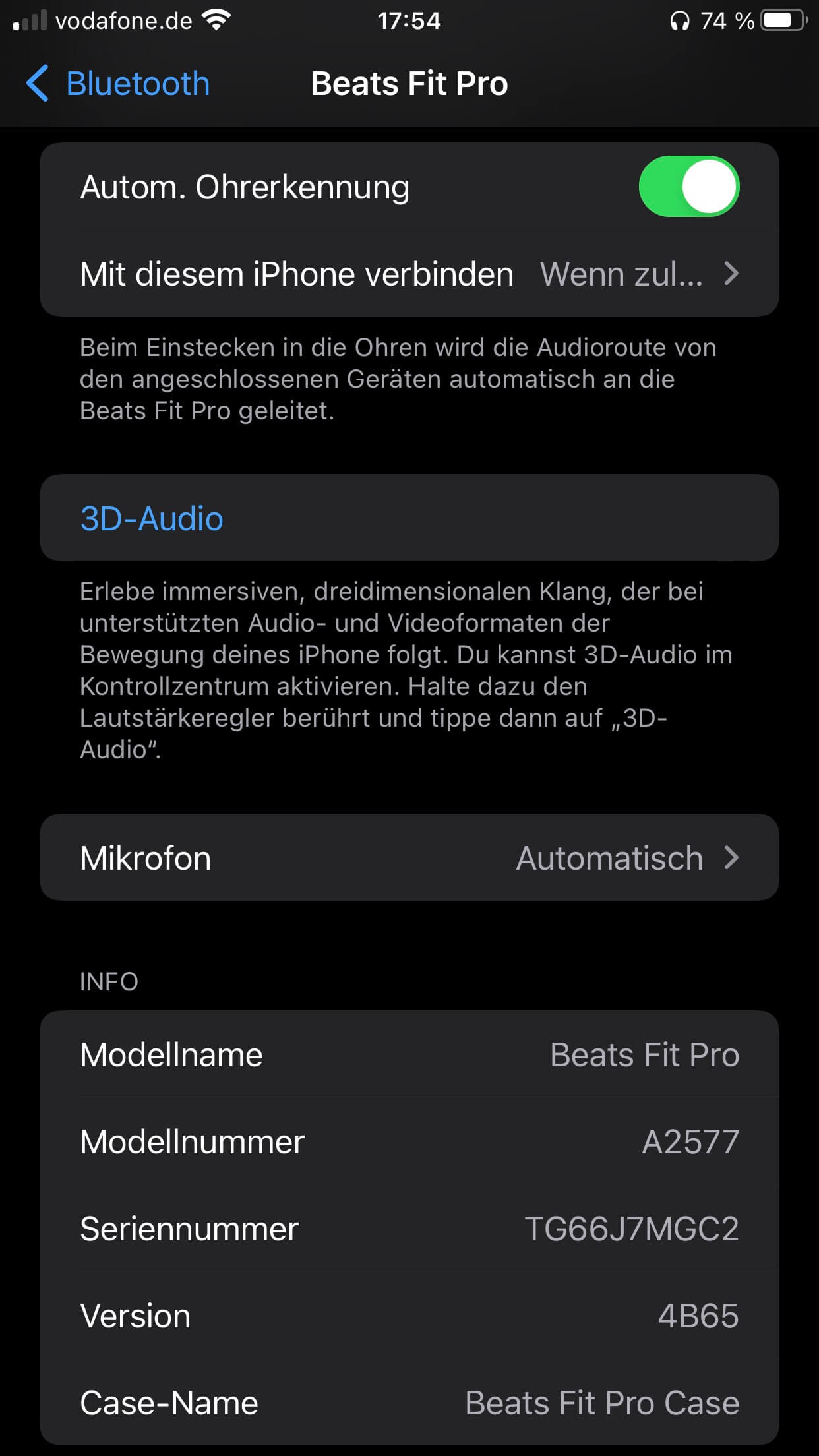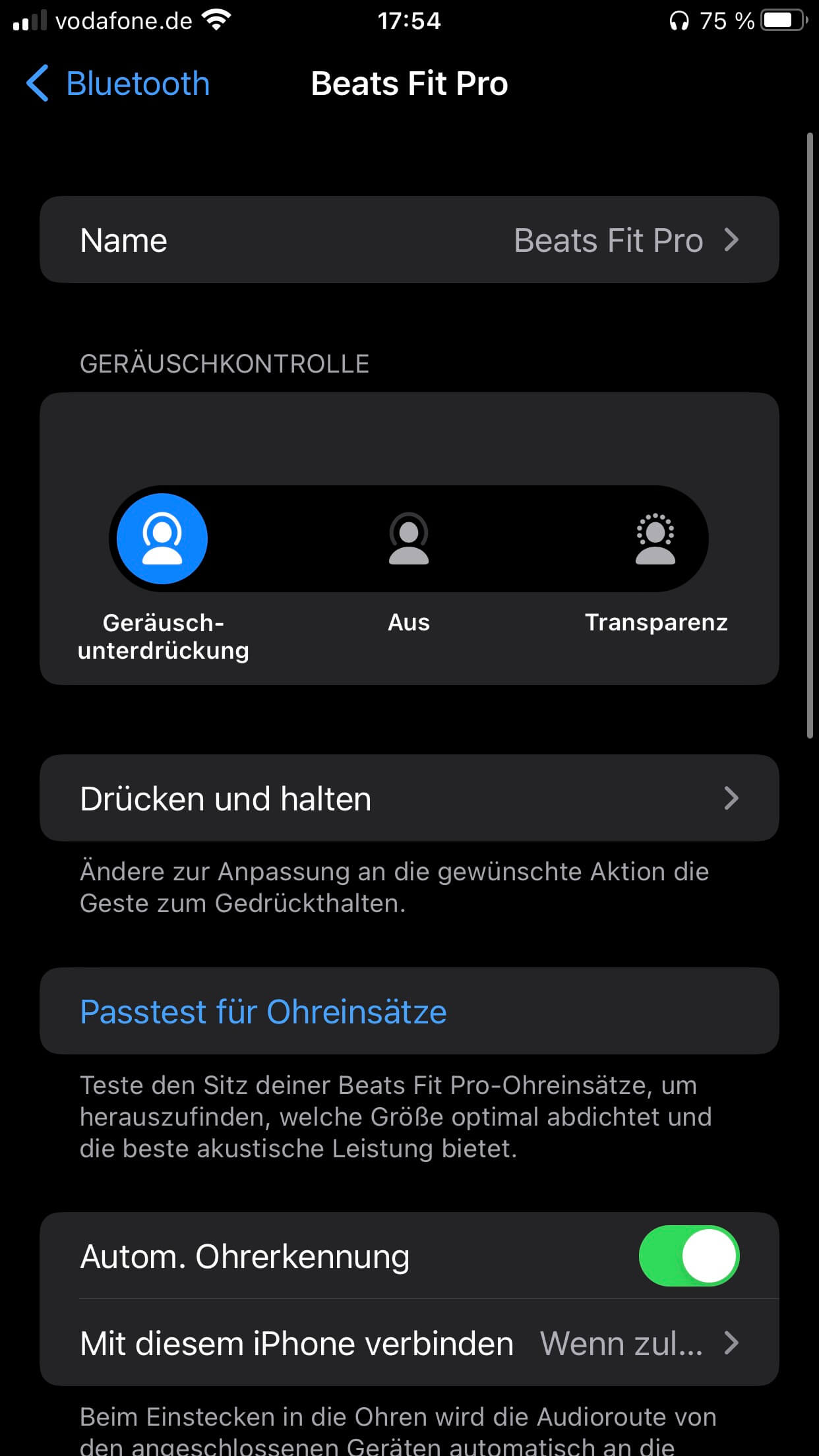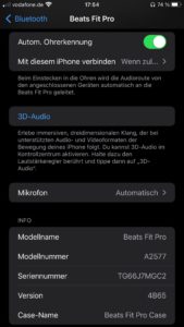 In den Systemeinstellungen können sodann Dinge wie Namensänderung, Geräuschkontrolle, Steuerung, Passtest für die Ohreinsätze oder die automatische Ohrerkennung konfiguriert werden. Auch mit welchem Gerät sich die Fit Pro wieder verbinden sollen, kann hier eingestellt werden. Der nahtlose Wechsel gelingt hiermit also genauso elegant, wie es die Apple AirPods 3 (zum Test) können. 3D-Audio, die Fixierung des Mikrofons auf einen der beiden Ohrhörer sowie diverse Infos finden sich hier ebenso.