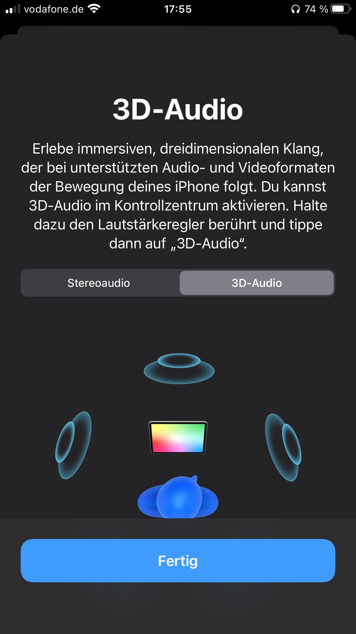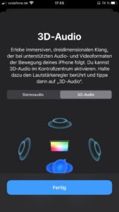 Schalten wir 3D-, bzw. Spatial Audio samt dynamischem Head Tracking ein, ändert sich das Klangbild entsprechend. Bei reinen Stereo Tracks klingt’s schon mal verwaschen im Bass, Inhalte in 5.1, 7.1 oder Dolby Atmos erzeugen natürlich eine Art Räumlichkeit, die man gut oder schlecht finden kann – das muss jeder für sich entscheiden.