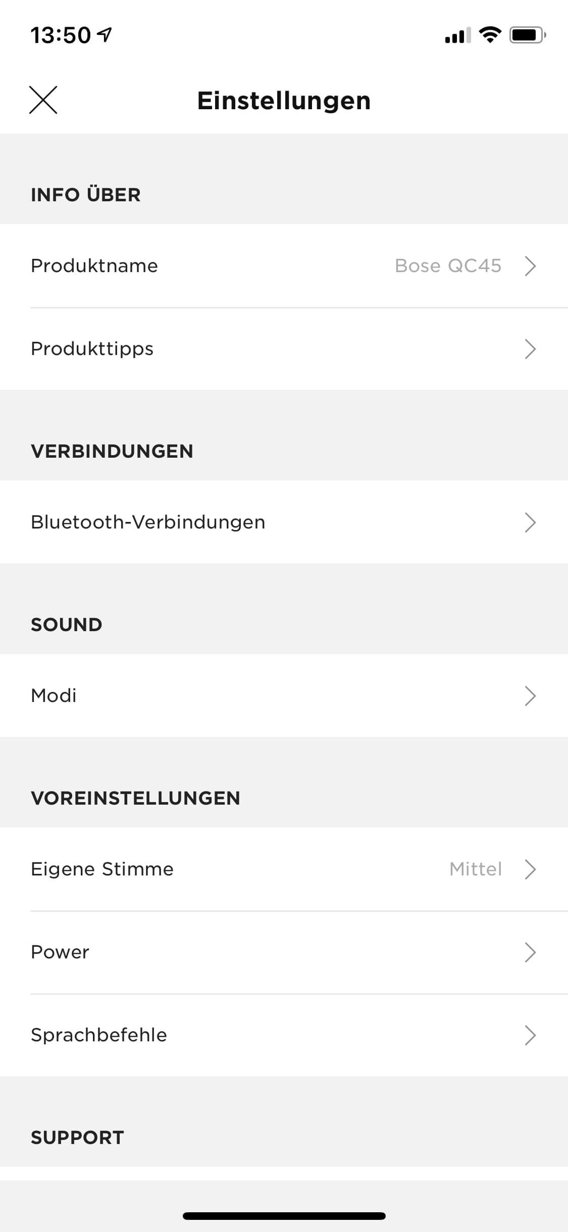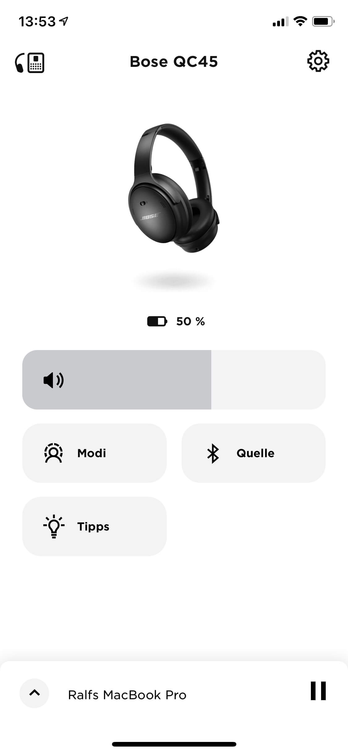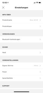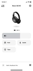 Die Bose Music App bietet alle wichtigen Zusatzinfos sowie einige paar Grundverwaltungsakte. Positiv ist hier, dass man nicht unbedingt ein Konto einrichten muss und weitestgehend anonymisiert den QC 45 nutzen kann.