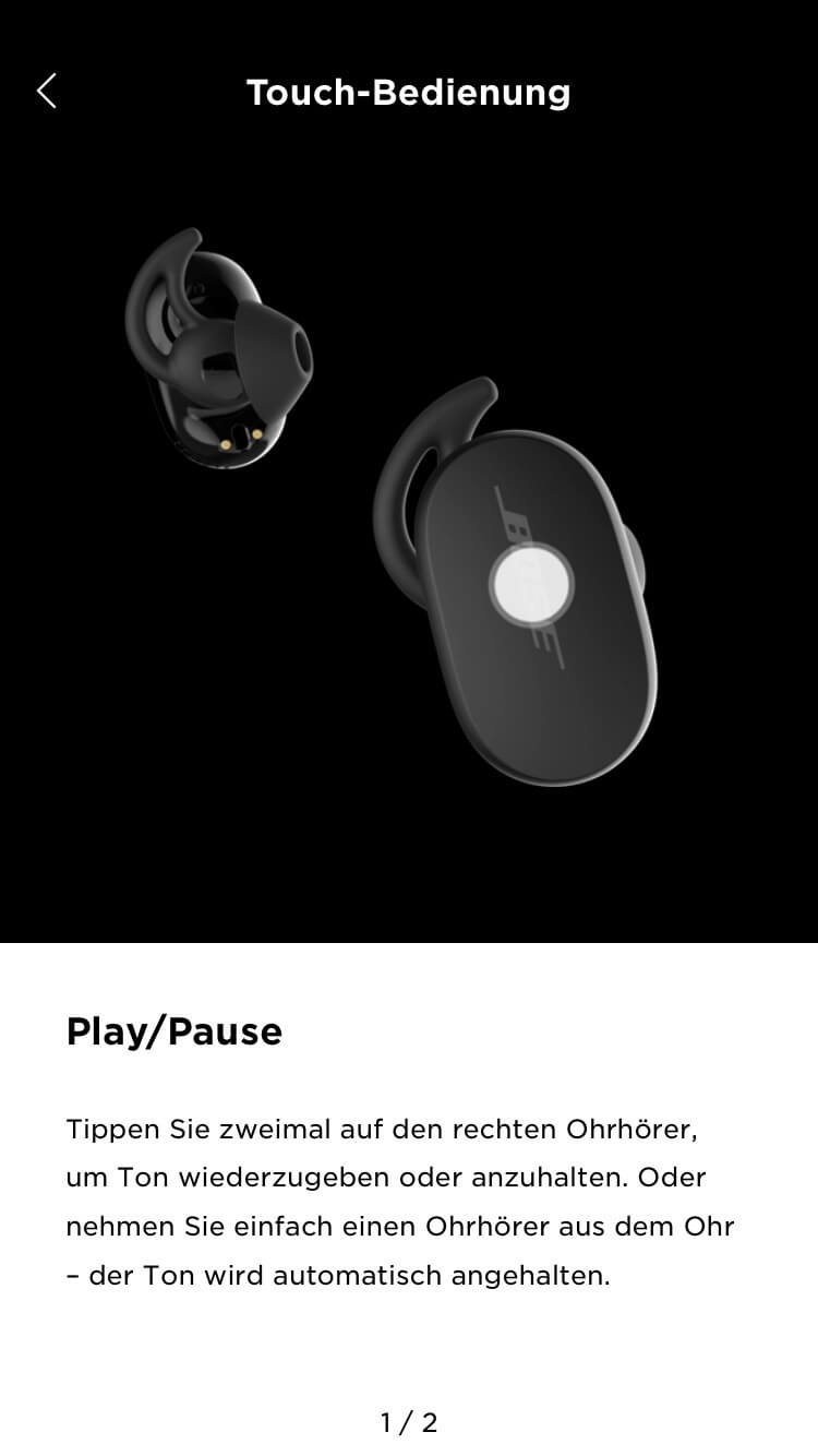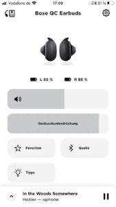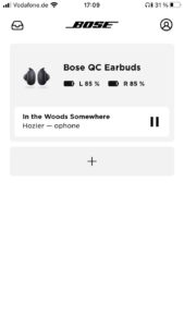 Apropos Dichtigkeit: Nasses Wetter und schweißtreibender Sport sind dank IPX4-Schutzklasse kein Problem. Die Kontaktaufnahme mit den Abspielgeräten funktioniert über Bluetooth 5.1 beim ersten Mal direkt Out-of-the-Box und gelingt problemlos. Später hilft ein Knopf am Lade-Case, um weitere Geräte zu suchen. Nach Erstkontakt wird man dabei auch direkt zum Download der „Bose Music App“ (iOS sowie Android) aufgefordert, in der sich so einiges an den In-Ears einstellen lässt und eine Geräteliste geführt werden kann, über die man zügig zwischen den Zuspielern wechselt, denn: Mit mehr als einer Quelle gleichzeitig verbinden sich die QuietComfort nicht. Oder noch mal in Englisch: No Multipoint!