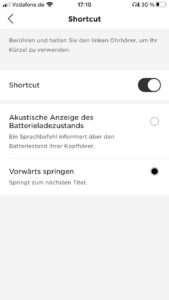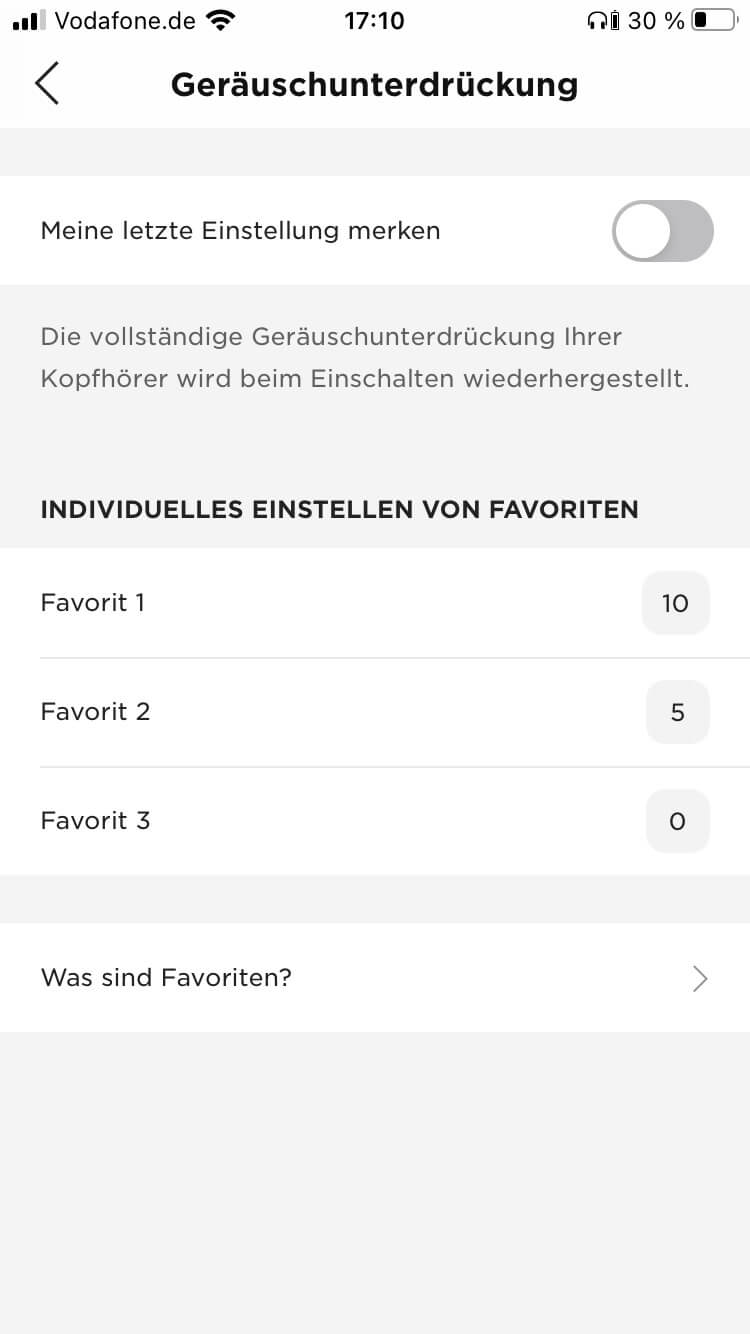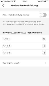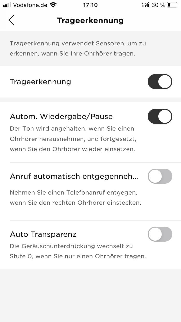 In der App lassen sich dann noch ein paar Einstellungen zur Trageerkennung machen und die Bluetooth-Verbindungen verwalten. Lautstärke und den Grad der Geräuschunterdrückung kann man hier auch mit zwei Schiebereglern anpassen.