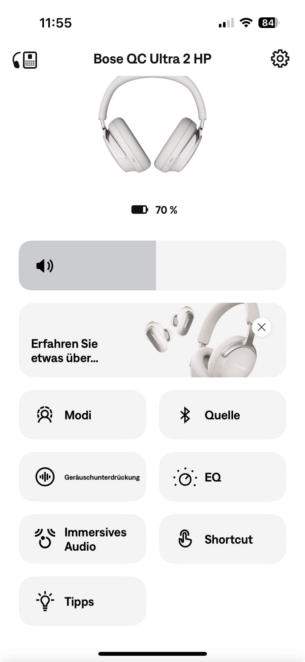 Die Bedienung des Bose QuietComfort Ultra Headphones 2 Gen ist überaus gelungen und benutzerfreundlich, da man so gut wie nie sein Handy aus den Taschen kramen muss. Fast alle Bedienschritte sind taktil oder per Sprachsteuerung möglich. Die App ist benutzerfreundlich und auch die Begrifflichkeit ist – soweit ich es für die englische und deutsche Sprache beurteilen kann – gelungen. Ein weiterer Pluspunkt ist die ausführliche Anleitung als PDF, die über die App via Bose-Web-Site heruntergeladen werden kann.