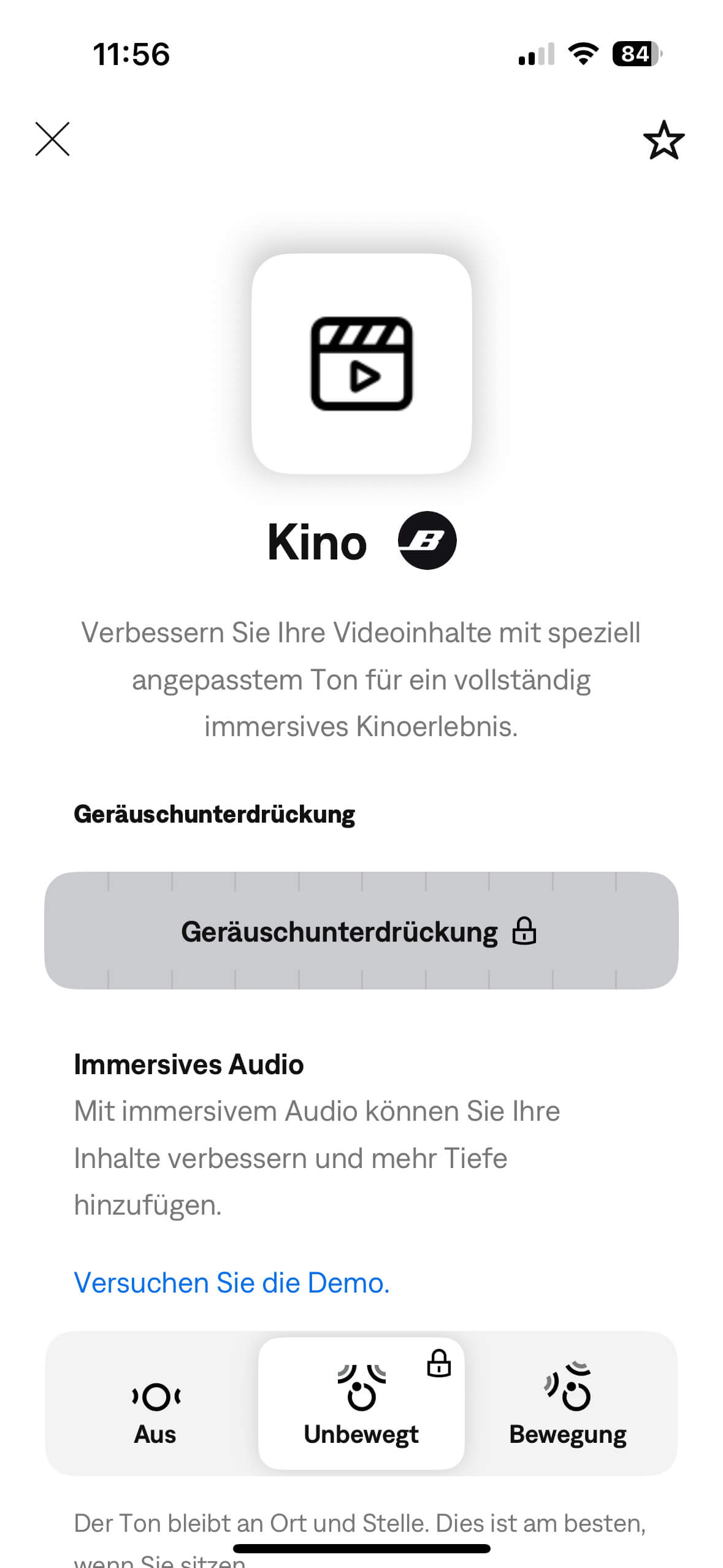 - Immersion schaltet den Spatial-Modus ein. In der App kann zudem das Headtracking (aus, starr, Bewegung) geregelt werden.