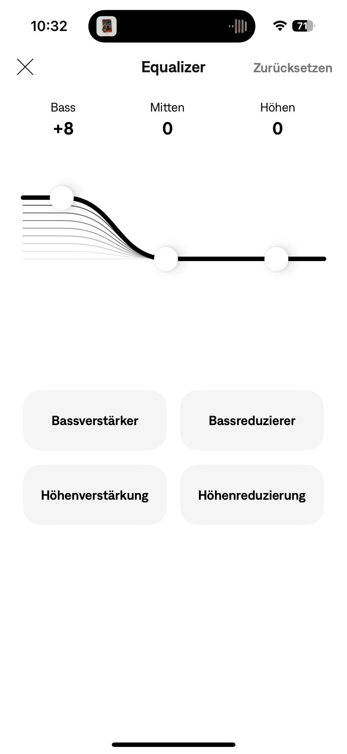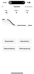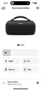 Die Steuerung der Box geschieht zunächst einmal über die Bedienleiste an der Oberseite. Start/Stop/Skip und Volumen sowie Quellenauswahl sind hier möglich. Für eine genauere Justage von Sound und Verhalten muss die Bose App installiert werden, wo neben Updates, Sprachansagen (die sehr detailliert sein können), Abschalttimer und Namensgebung auch noch ein 3-Band-EQ mit vier Presets bereitgestellt wird.