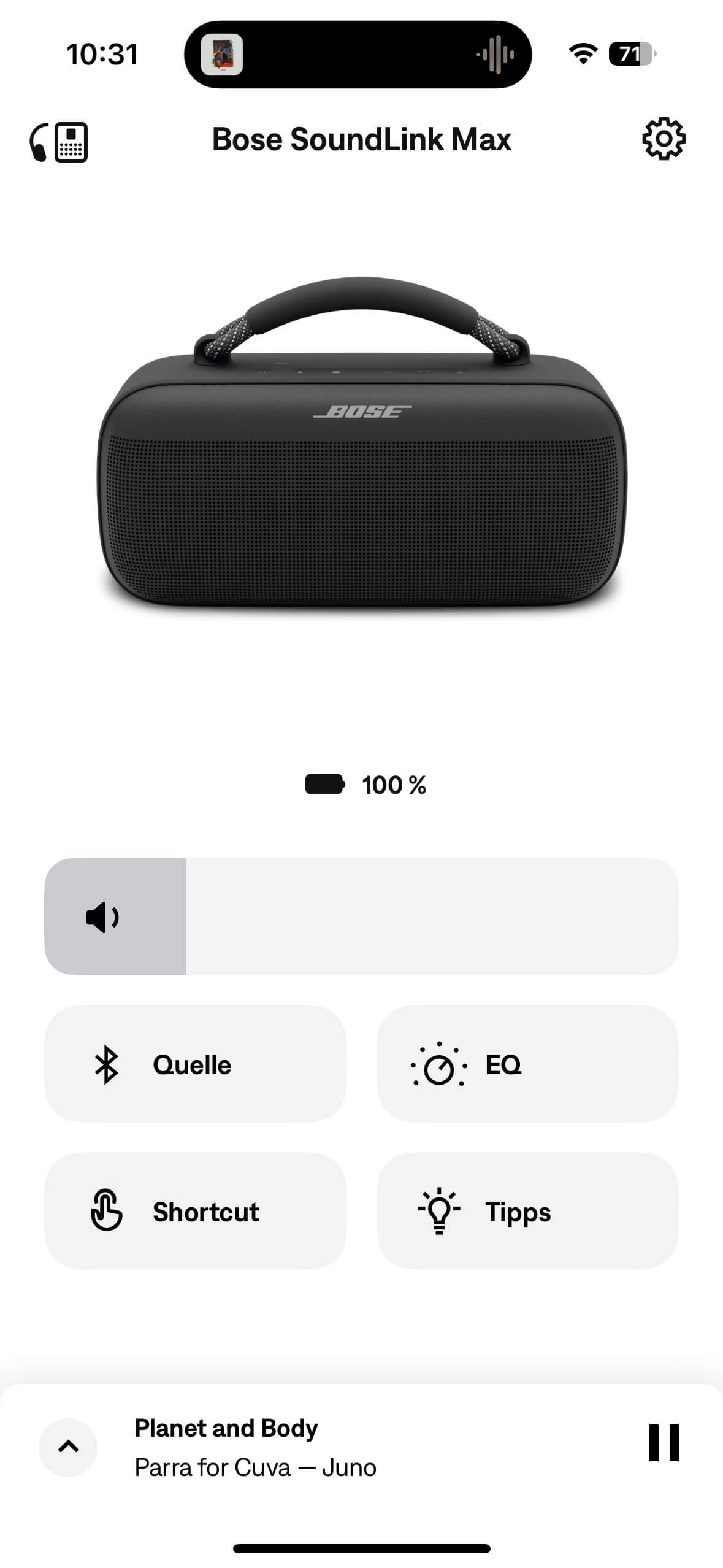 Reichweitentechnisch gibt Bose neun Meter an, was reichlich zurückhaltend ist. Bei freier Sicht komme ich auf mindestens 30 Meter und selbst im Haus bleibt die Verbindung über zwei Räume hinweg stabil. Dank des analogen Aux-Eingangs kann der SoundLink Max aber auch am Kabel betrieben werden. Einfach einstecken, die Box schaltet automatisch auf diesen Eingang um.