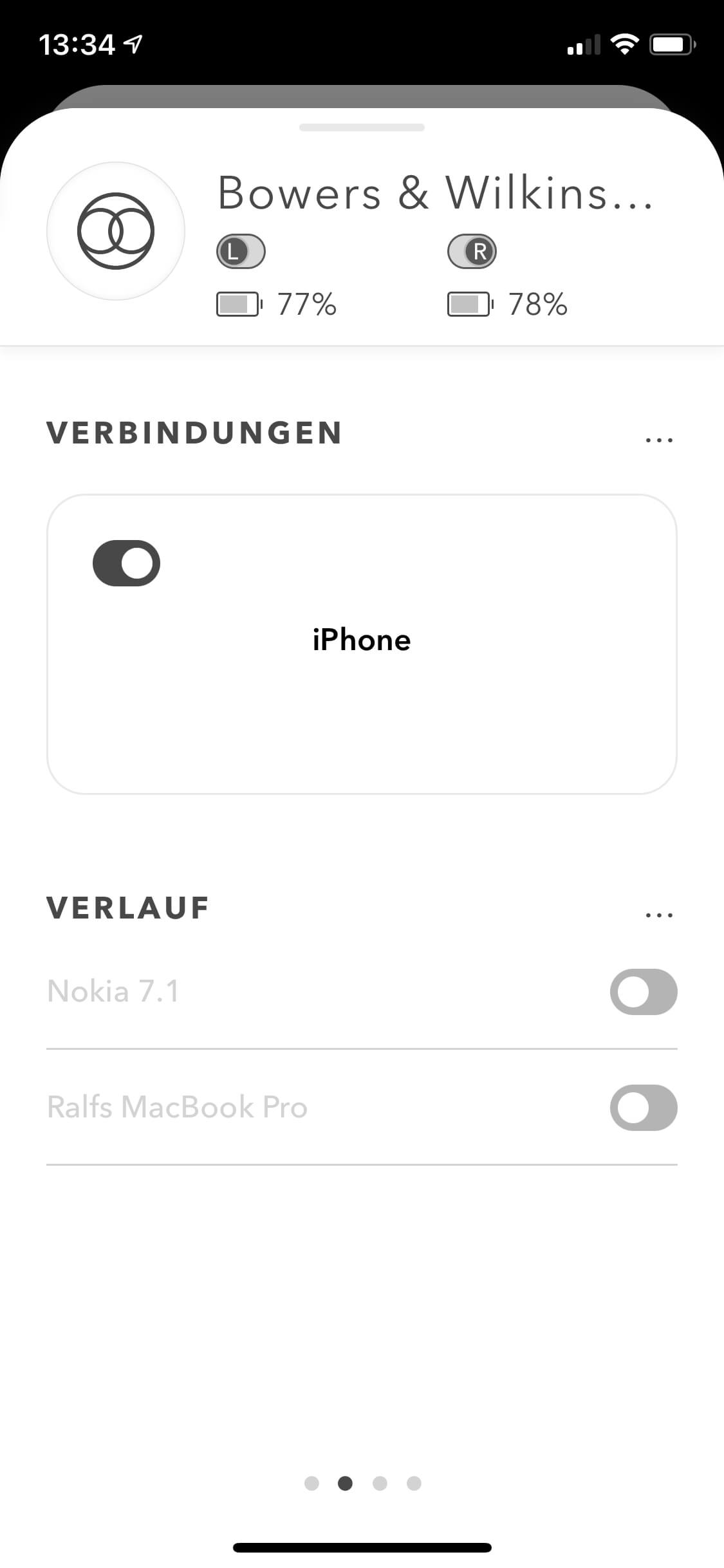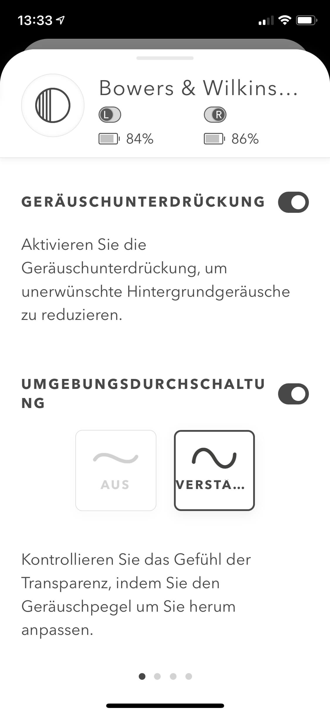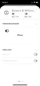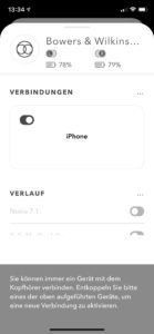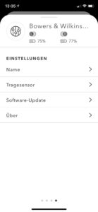 Die PI5 bieten Bluetooth 5.0 mit aptX-, AAC- und SBC-Codecs und lassen sich in wenigen Schritten mit mobilen Devices erstverbinden. Die Wiederaufnahme geschieht dann sowohl unter Android als auch iOS sofort und an der Audio-Stelle, an der bei der letzten Verbindung per Pause unterbrochen wurde. Da Bowers & Wilkins mit den PIs kein Multipoint anbietet, muss man leider zunächst die Verbindung zum ersten Gerät trennen, um sich mit einem anderen zu verbinden. Dieser Umstand ist ein wesentlicher Komfortnachteil gegenüber dem Apple-Kosmos mit Apple- bzw. Beats-Hörern, was sich in der kostenfreien B&W-App zumindest relativ einfach erledigen lässt. Ansonsten verwaltet die App nur das Wichtigste: Noise Cancelling und Transparenzmodus, Koppeln und Trennen bzw. Verwalten der Bluetooth-Geräte, deaktivieren der Sensorik sowie Software-Updates. Der ein oder andere User-Eingriff mehr wäre noch wünschenswert gewesen, zumal der Hersteller beim PI7 in puncto App-Verwaltung ein deutlich größeres Feature-Set anbietet.