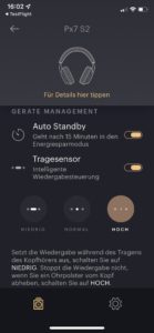 Die integrierten Tragesensoren möchte ich nicht unerwähnt lassen. In drei Empfindlichkeitsstufen kann – via App gesteuert – der Kopfhörer schon beim Anheben einer Seite die Musik stoppen, oder erst beim Absetzen bzw. bei der dritten Stufe gar nicht. Dann sollte man allerdings die Auto-Stand-by-Zeit nach 15 Minuten aktiviert haben, damit der Akku nicht grundlos leerläuft.