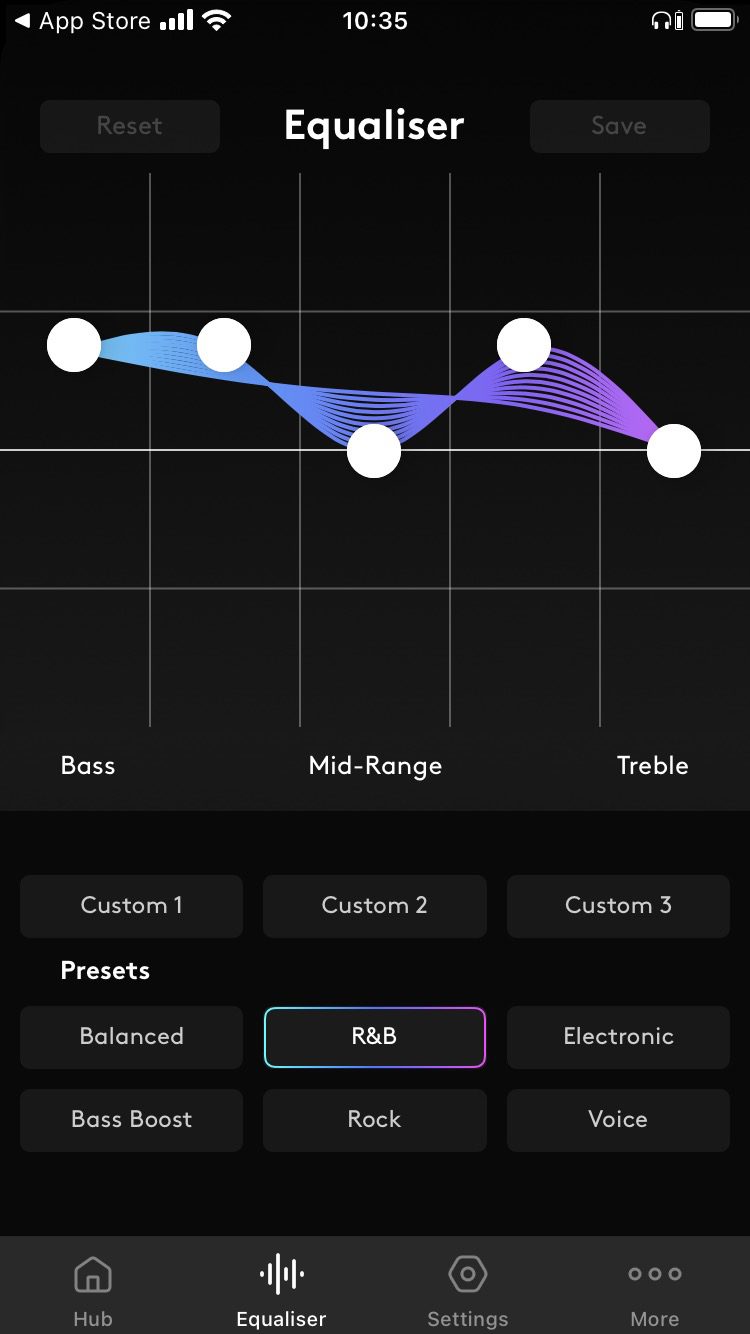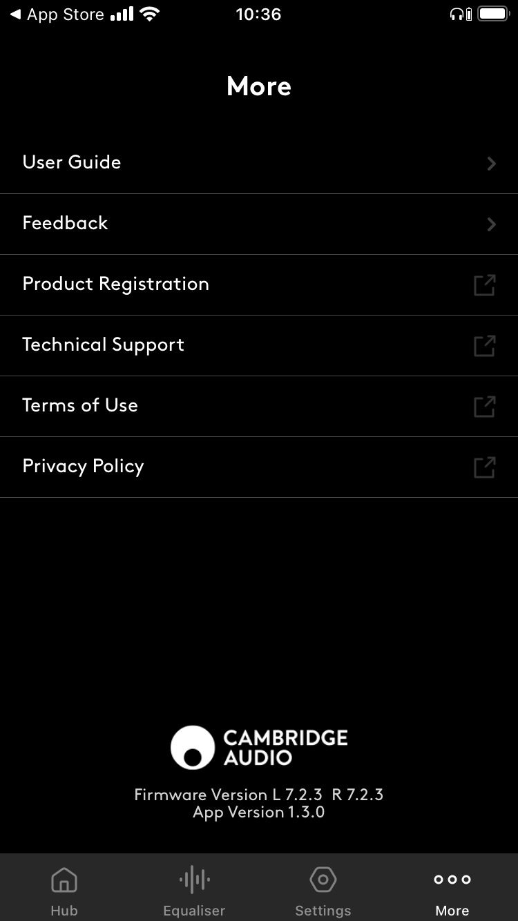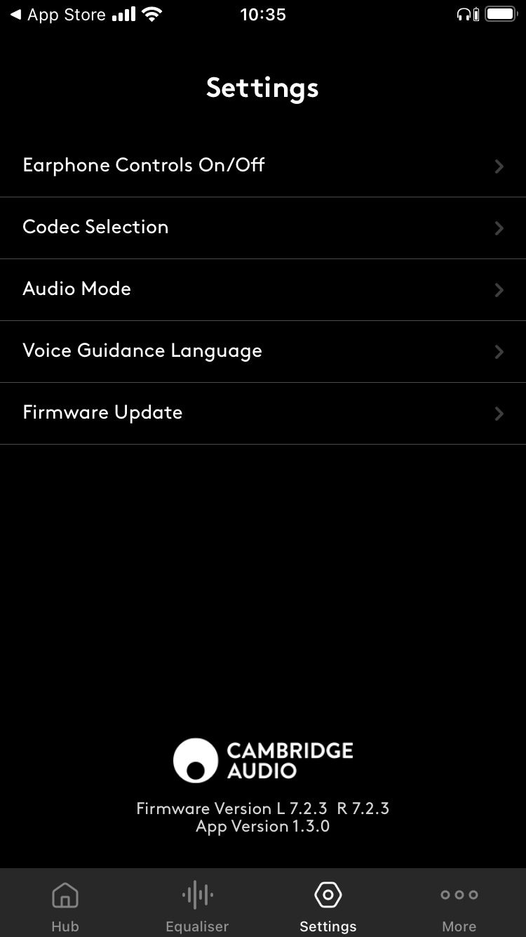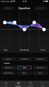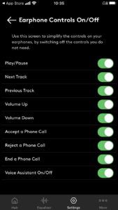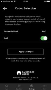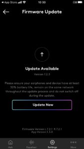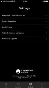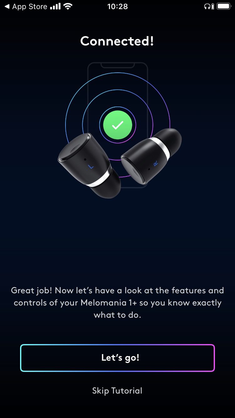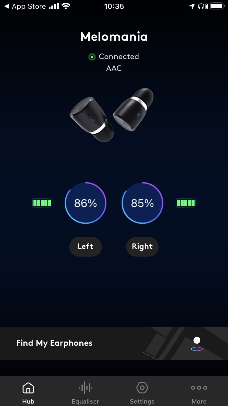 Neu ist die Unterstützung der kostenlosen und übersichtlichen iOS/Android-Melomania App mit Location-Service. Diese bietet neben Firmware-Updates auch Status-Informationen zum Ladestand, einen flexiblen fünfbandigen Equalizer mit mehreren Presets und drei eigenen Speicherplätzen, eine manuelle Codec-Auswahl (für Android) sowie die Auswahl der Betriebsart („High Performance“ oder „Lower Power“). Des Weiteren lässt sich noch die Sprache der Mitteilungen ändern sowie auf das Handbuch zugreifen. Dazu lassen sich die genannten Kurzbefehle einzeln über die App im Sinne einer einfacheren Bedienung deaktivieren, aber nicht neu definieren.