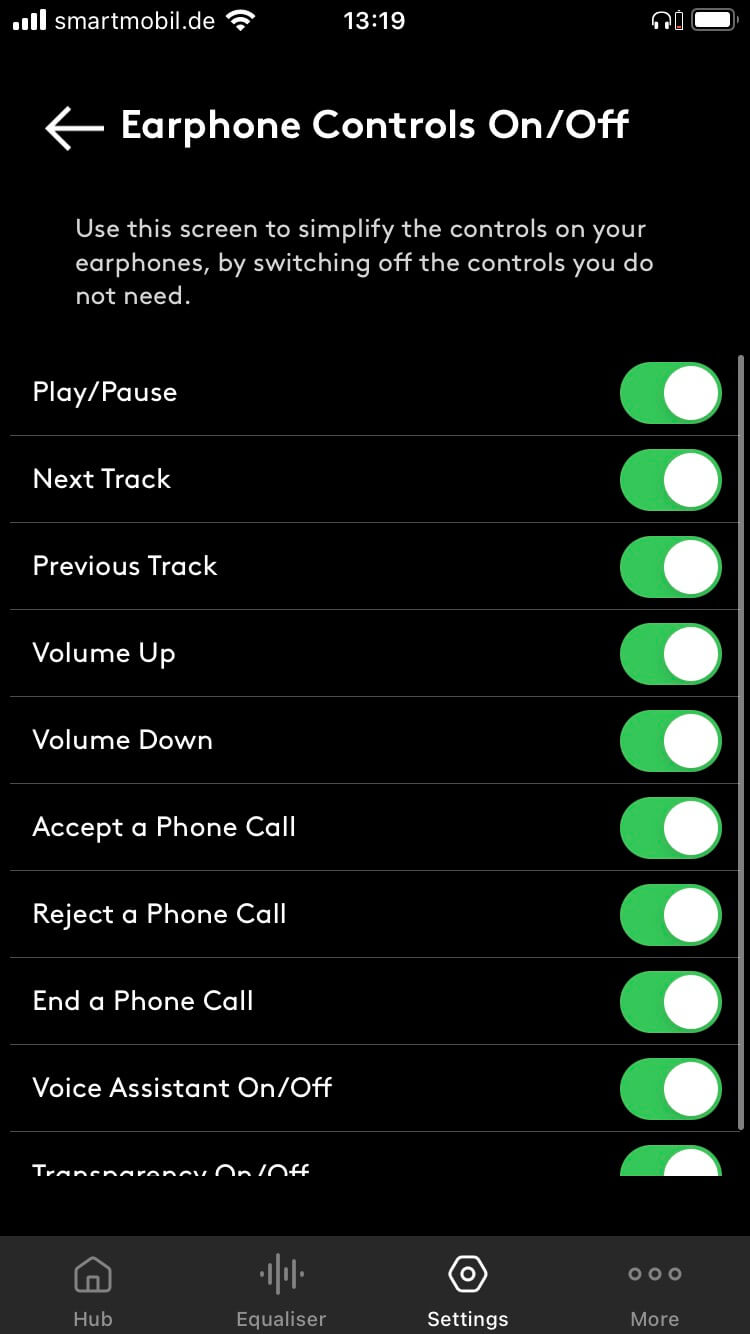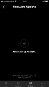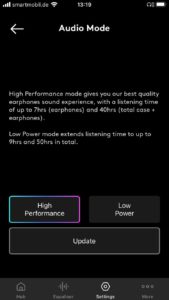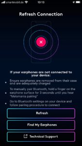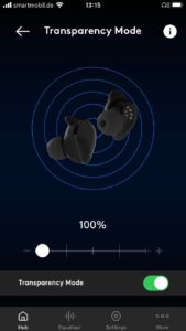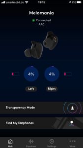 Für die Konfiguration sorgt die kostenlose Melomania-App für iOS und Android. Sie ermöglicht Updates (Test mit Version 1.18), zeigt den Ladestand der Akkus an, bietet eine mögliche Ortung der Kopfhörer bei Verlust und besagte umfassende Konfiguration der berührungsempfindlichen Flächen. Zur Verfügung stehen Play/Pause, Track Skipping, Lautstärke, Telefonate, der Aufruf eines Sprachassistenten (Siri, Google Assistant) sowie das Aktivieren eines in der Intensität regelbaren Transparenzmodus, der Außengeräusche über die verbauten Mikrofone in den Hörgang einblendet, um besser bei aufgesetzten Kopfhörern mit der Umwelt kommunizieren zu können. Dabei kommen die bekannten Einfach- und Mehrklicks und längere Berührungen in Kombination mit Ansagen (die Sprache ist wählbar) zum Einsatz. Ungewollte Funktionen schaltet man schlicht ab, um die Bedienung zu vereinfachen – ein sinnvoller Weg. Noch schöner hätte ich es gefunden, wenn der Transparenzmodus sich auch durch Berühren und Halten nur temporär aktivieren ließe.