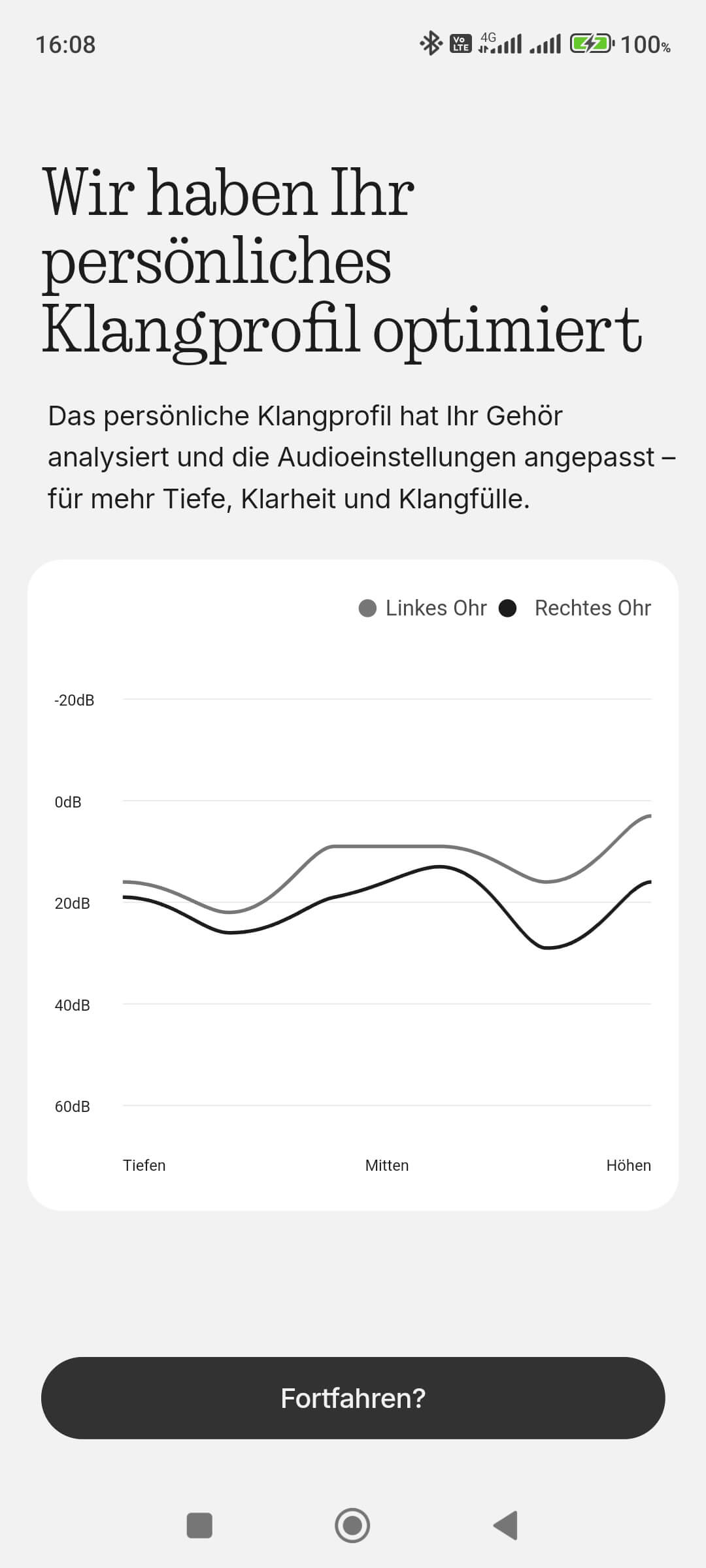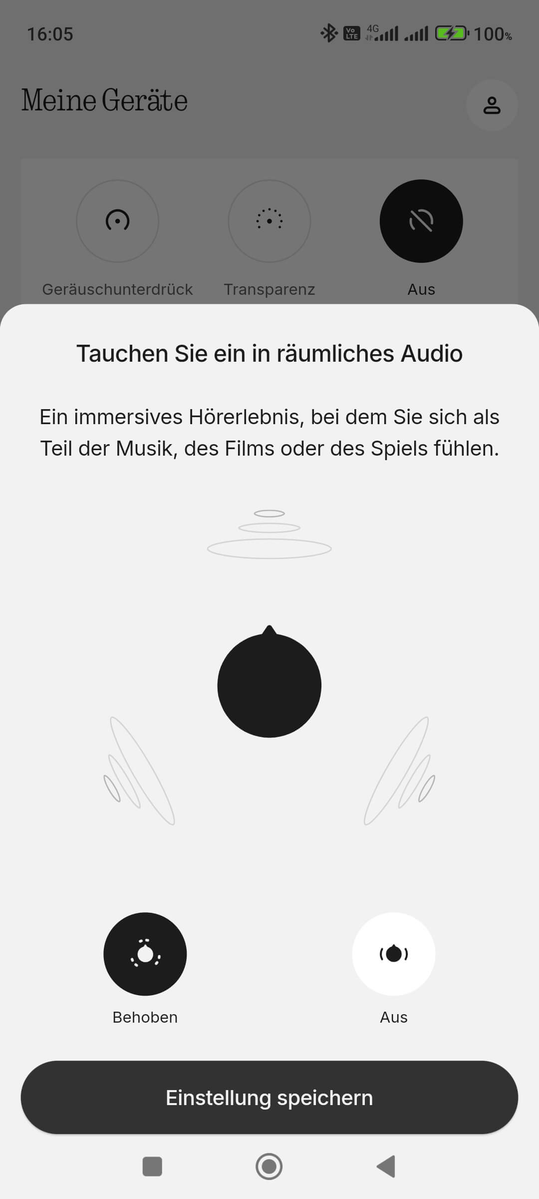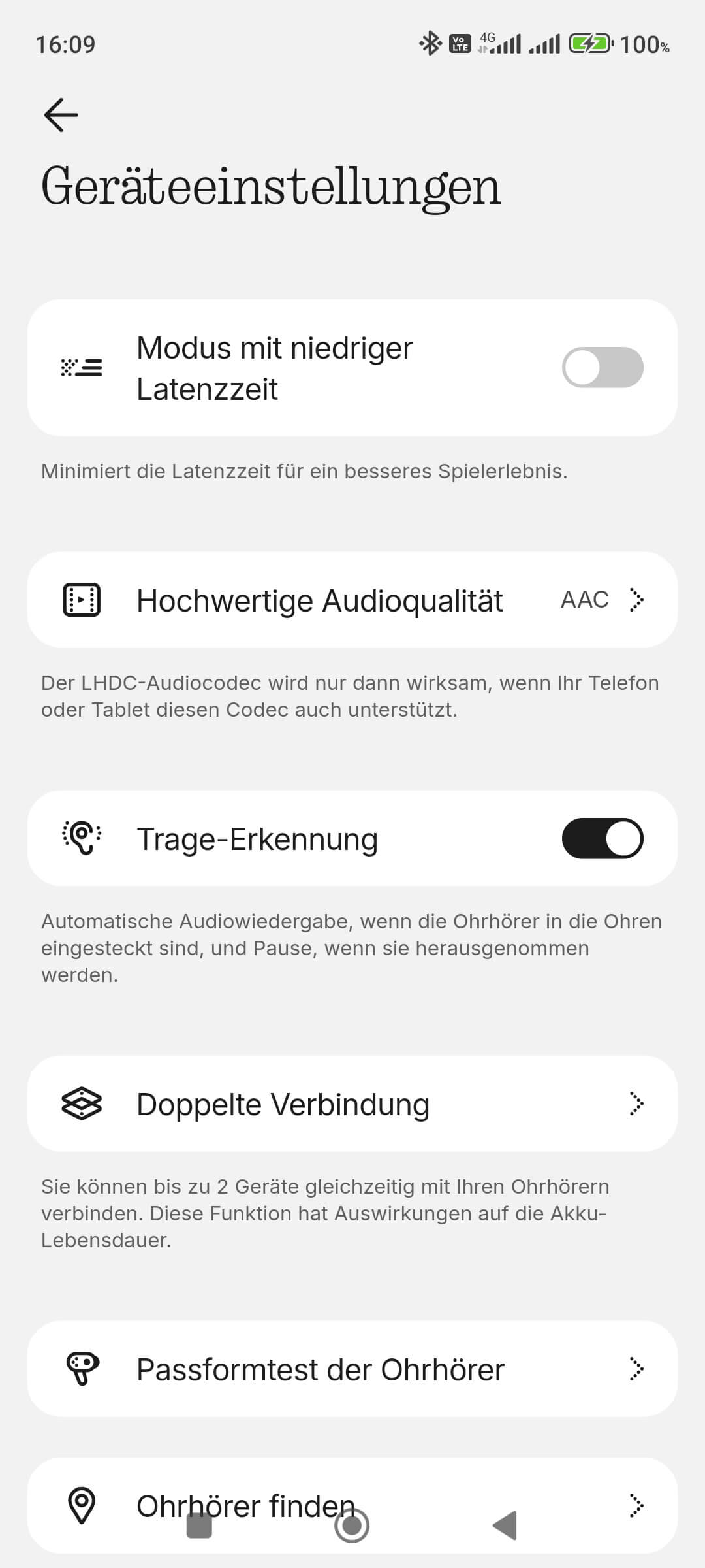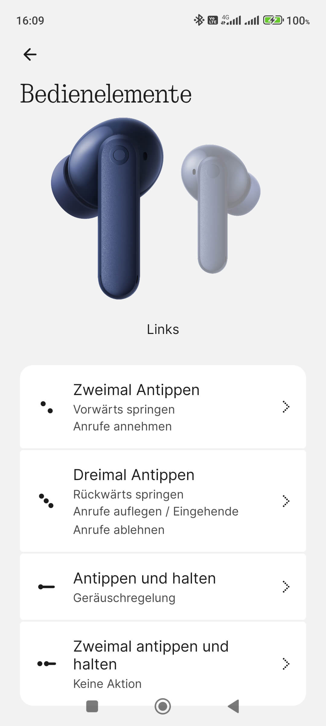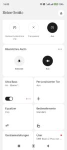 Einmal gelernt, sorgen die Befehle der Touchsteuerung für eine intuitive Bedienung. So können Musik, aktive Geräuschunterdrückung und Anrufe mühelos gesteuert werden. Zu den weiteren Funktionen gehören eine automatische Trageerkennung sowie einige App-spezifische Features, nämlich Auffinden-Funktion, Spatial-Audio-Effekt, integrierter Equalizer und die klangliche Personalisierung per Hörtest. Die versprochene Integration von ChatGPT stellt sich als generelle Anbindung eines Sprachassistenten heraus. Voraussetzung ist, dass eine KI-App wie die von ChatGPT, Perplexity AI oder ähnliche auf dem Smartphone installiert ist. Dann lässt sich die Touchsteuerung der In-Ears so programmieren, dass sie den Sprachassistenten der Wahl aufruft.