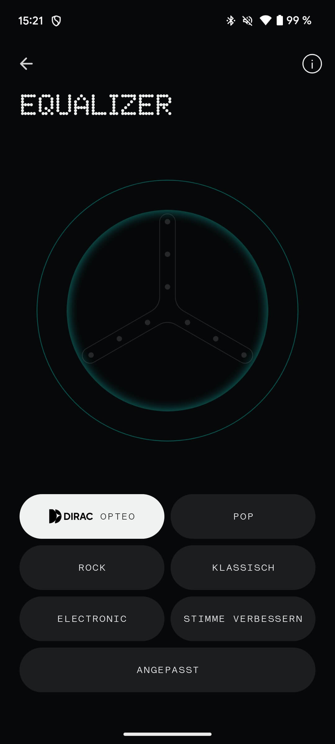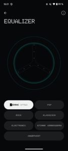 Der Equalizer selbst besitzt sechs Presets („Dirac Opteo“, „Pop“, „Rock“, „Klassisch“, „Electronic“, „Stimme verbessern“) sowie drei Bänder („Bässe“, „Mitten“, „Höhen“) für eigene Anpassungen.
