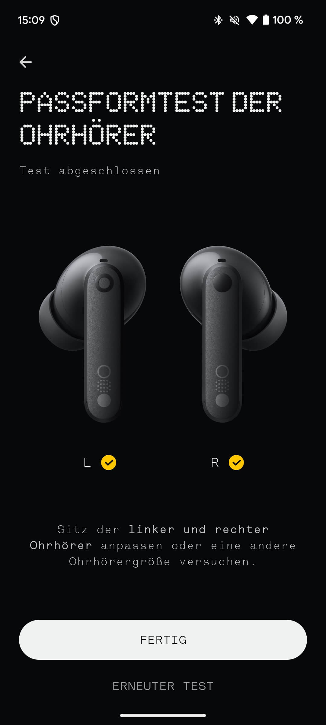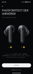 Dank des ergonomischen Designs und der leichten Bauweise bieten die CMF by Nothing Buds Pro 2 einen prinzipiell guten Tragekomfort und sicheren Halt. Prinzipiell deshalb, weil man bei diesem Modell merkt, wie individuell unsere Ohren doch sind: Die verschiedenen Ohrstöpselgrößen ermöglichen natürlich eine entsprechende Anpassung, dennoch wirken sie verglichen mit einigen Konkurrenten recht klein. Ich benötige in der Regel Größe L um einen bestmöglichen Sitz, sprich eine optimale Abdichtung des Gehörgangs, zu erreichen. Leider klappt das mit den mitgelieferten nicht, sodass ich auf Drittanbieter-Stöpsel ausweichen musste. Denn bei mir spuckte der Passformtest via App nie ein positives Ergebnis aus.