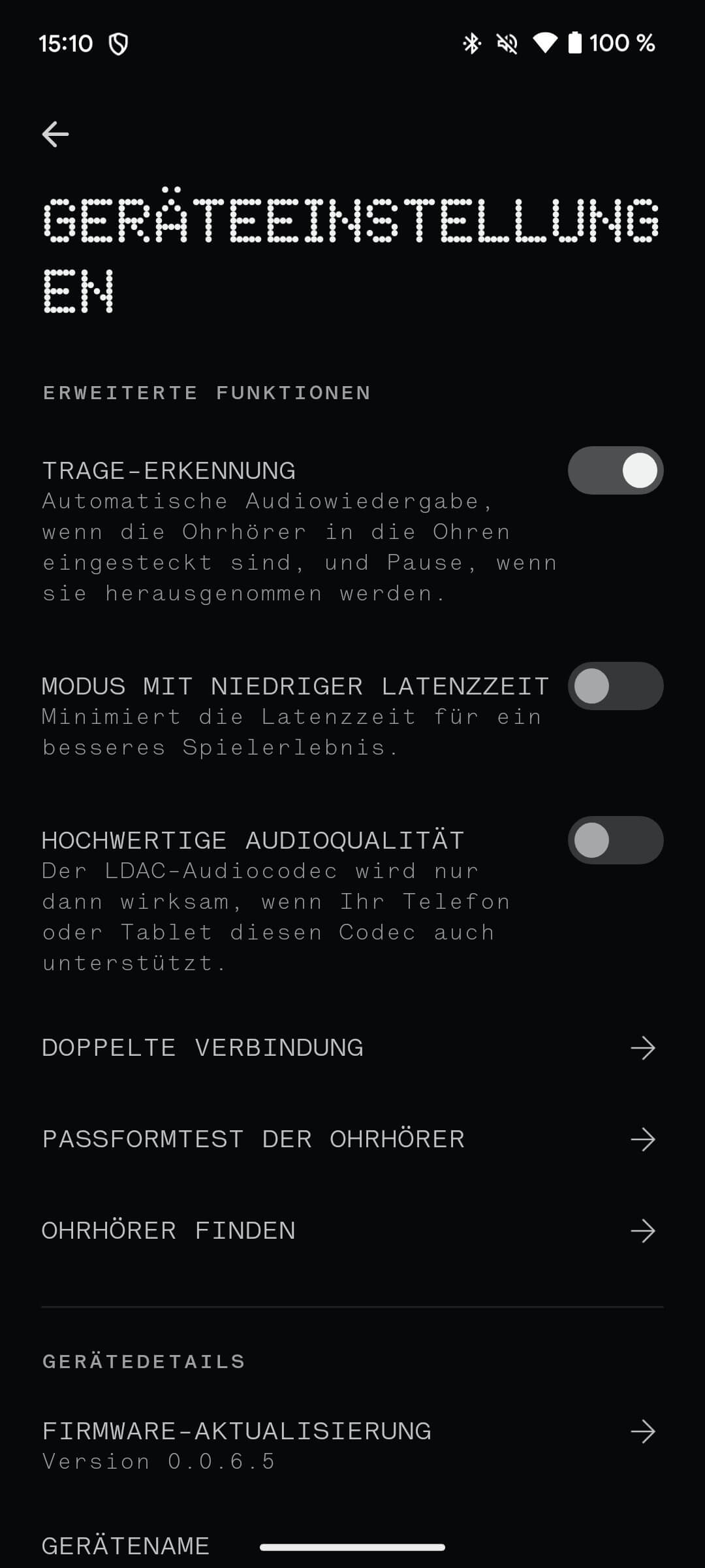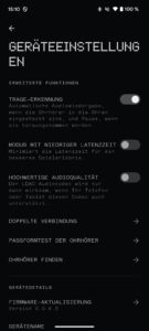 Ein Gaming-Modus mit reduzierter Latenz, die Trageerkennung (Auto Pause), den Passformtest, die Ohrhörer-Finden-Funktion sowie die Verwaltung von Multipoint-Verbindungen gibts in den Geräteeinstellungen.