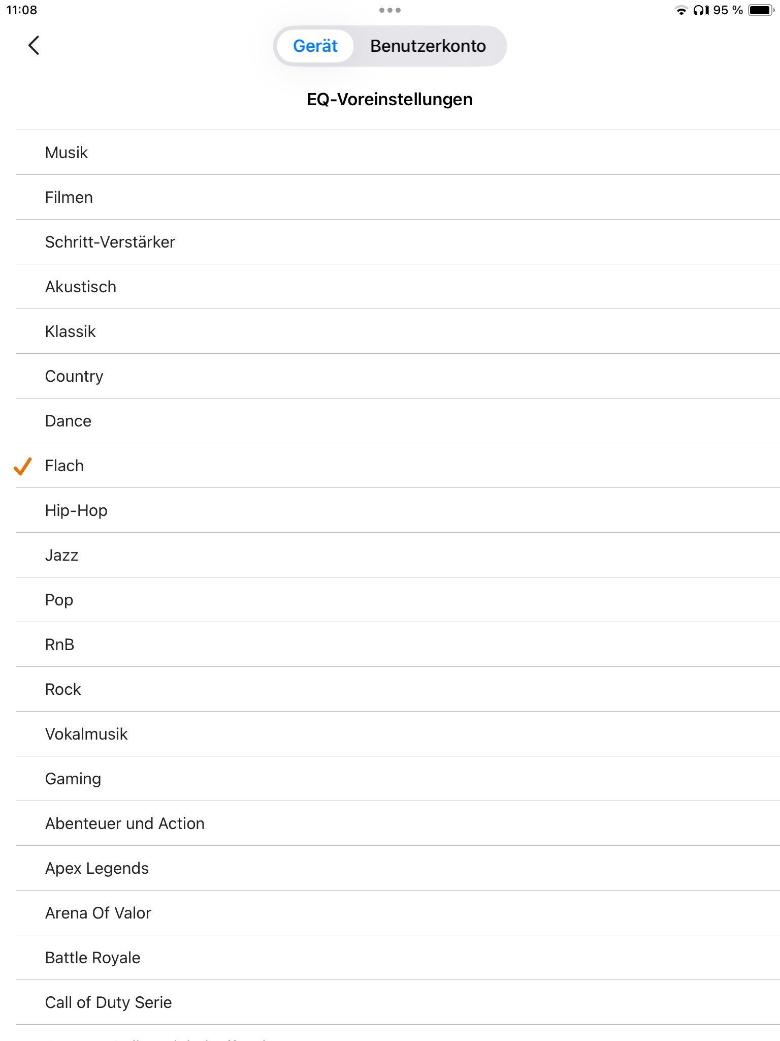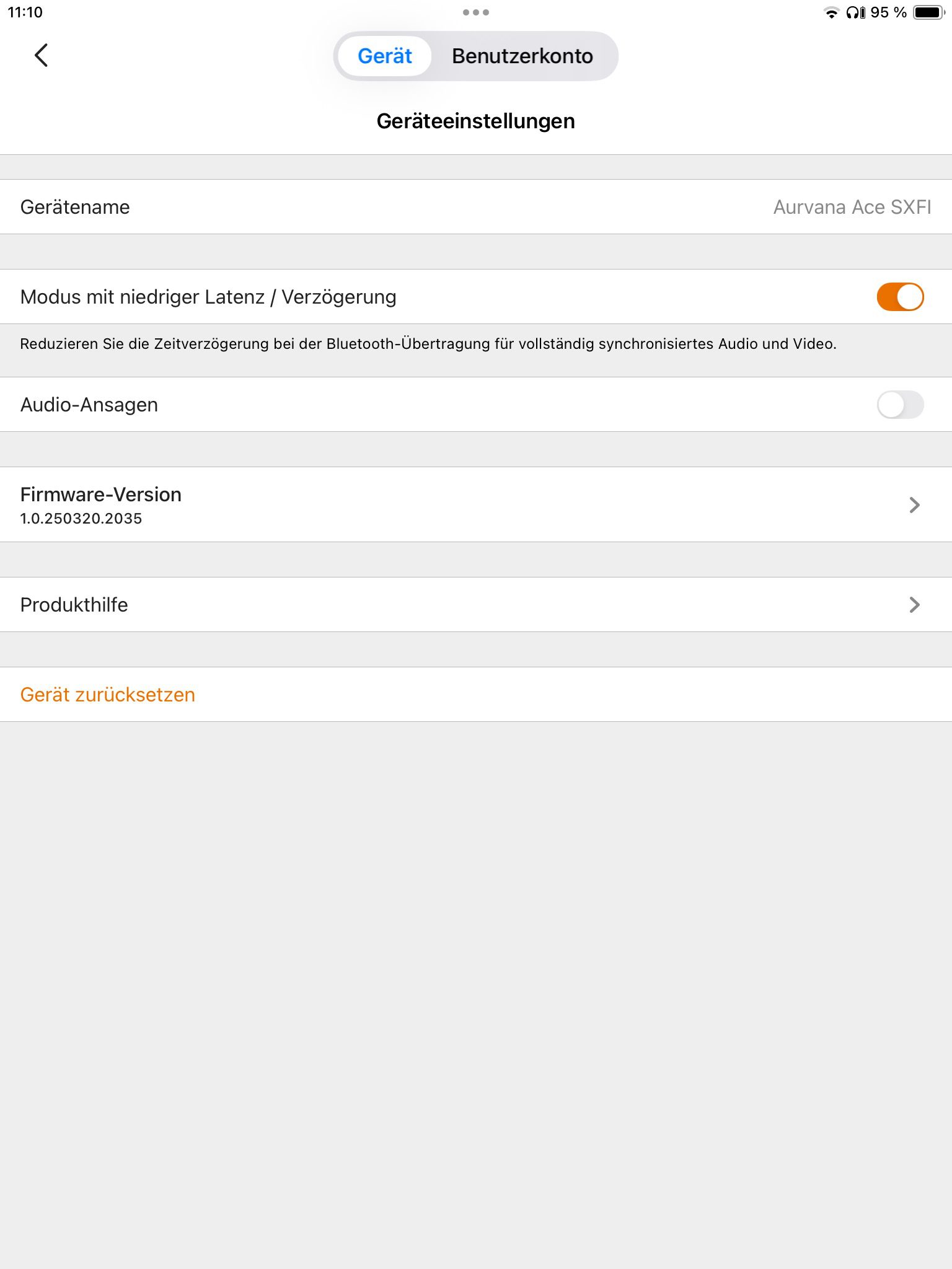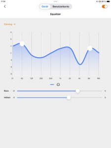Des Weiteren unterteilt sich die Umgebungssteuerung der Creative Aurvana Ace SXFI in eine statische Geräuschunterdrückung mit vier Stufen und eine adaptive Variante, die sich selbstständig an das Umfeld anpasst. Auch der Umgebungsmodus ist vierstufig umgesetzt und regelbar. Außerdem kann über die App die Firmware aktualisiert und der Low-Latency-Modus (de-)aktiviert werden. Das ist auch bei den Sprachansagen möglich, die leider zu laut abgestimmt sind und sich nicht anpassen lassen.