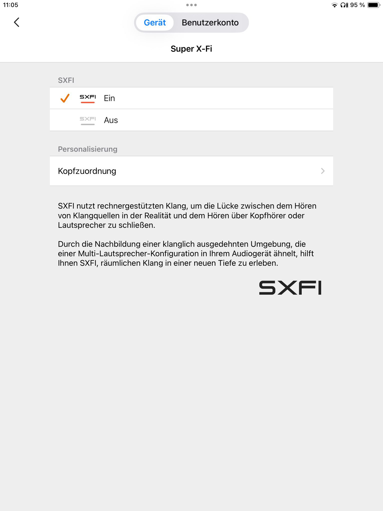 Mit 43 Voreinstellungen für Film, Musik und Gaming bietet die Klangregelung der App-Anbindung (Android und iOS) eine umfangreiche Auswahl, wobei sich die Settings auch als Ausgangsbasis für eigene Anpassungen nutzen lassen. Zudem steht ein 10-Band-EQ zur Verfügung, um Presets zu erstellen. Praktisch ist, dass wie bei den Creative Zen Hybrid SXFI Over-Ears (zum Test) ein direkter Zugriff auf die Super X-Fi-Technologie besteht. Durch die Integration in die Creative App kann die räumlichere Wiedergabeoption auch bei gestreamten Medien eingesetzt werden, was eine vielseitige Nutzung ermöglicht. Zum Personalisieren der sogenannten Audio-Holografie für Kopfhörer wird allerdings nach wie vor die SXFI App benötigt. Dabei setzt das Head Mapping eine Registrierung voraus.