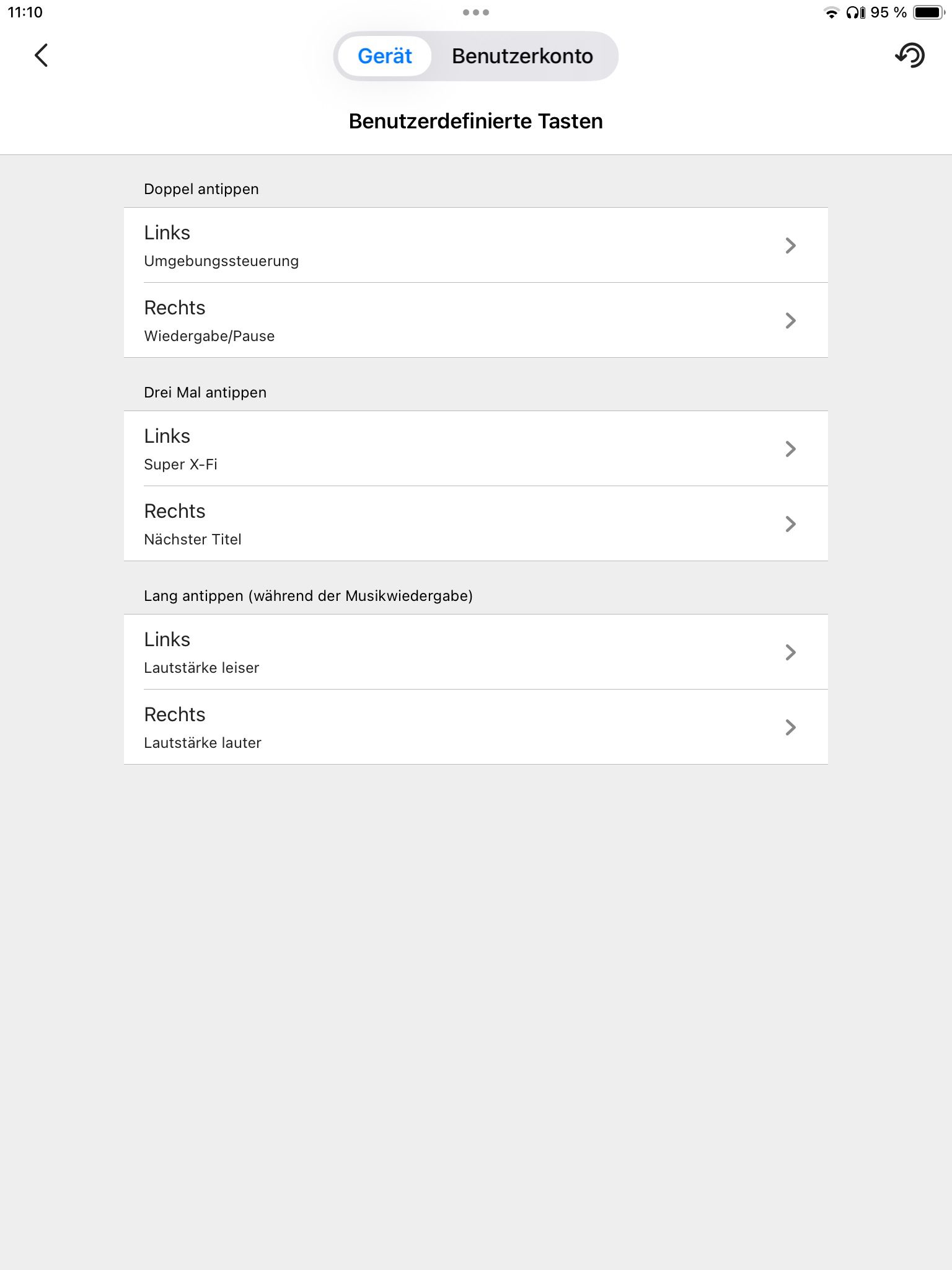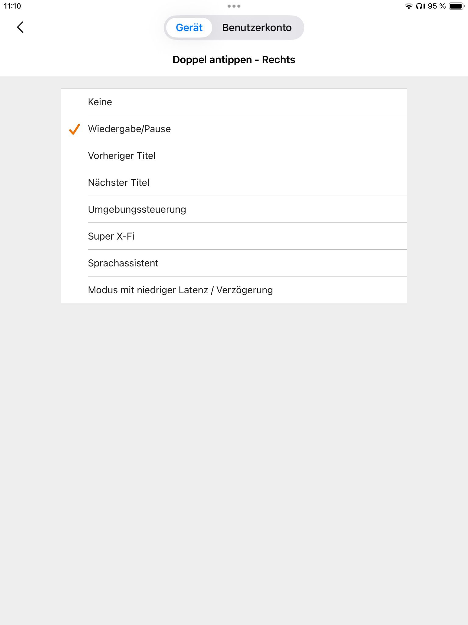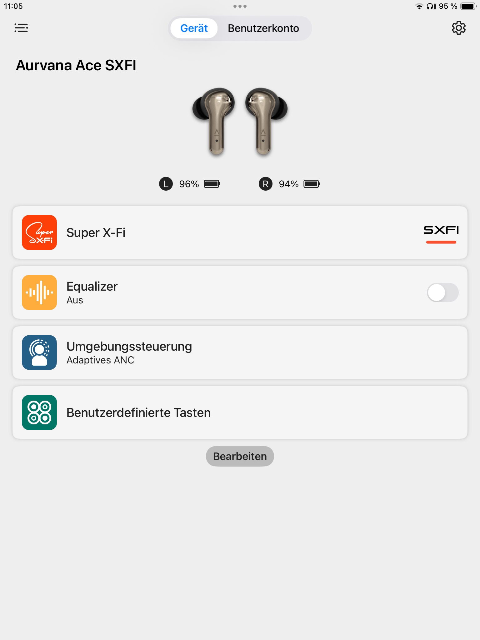 Ab Werk lassen sich die berührungsempfindlichen Höreroberflächen der Creative Aurvana Ace SXFI zum Starten der Wiedergabe, Einstellen der Lautstärke, Vorspringen und Abwickeln von Telefonaten nutzen. Auch Super X-Fi kann direkt über die In-Ears zugeschaltet werden, zumal ein Umschalten zwischen Standardbetrieb, Umgebungsmodus und Geräuschunterdrückung möglich ist. Per App kann die Belegung dabei an die eigenen Vorlieben angepasst werden. Ein Halten ist zwar für die Lautstärkeregelung reserviert, zwei- und dreifaches Tippen sind aber konfigurierbar, wodurch sich bei Bedarf der Sprachassistent, ein Zurückspringen oder der Low-Latency-Modus auswählen lassen.