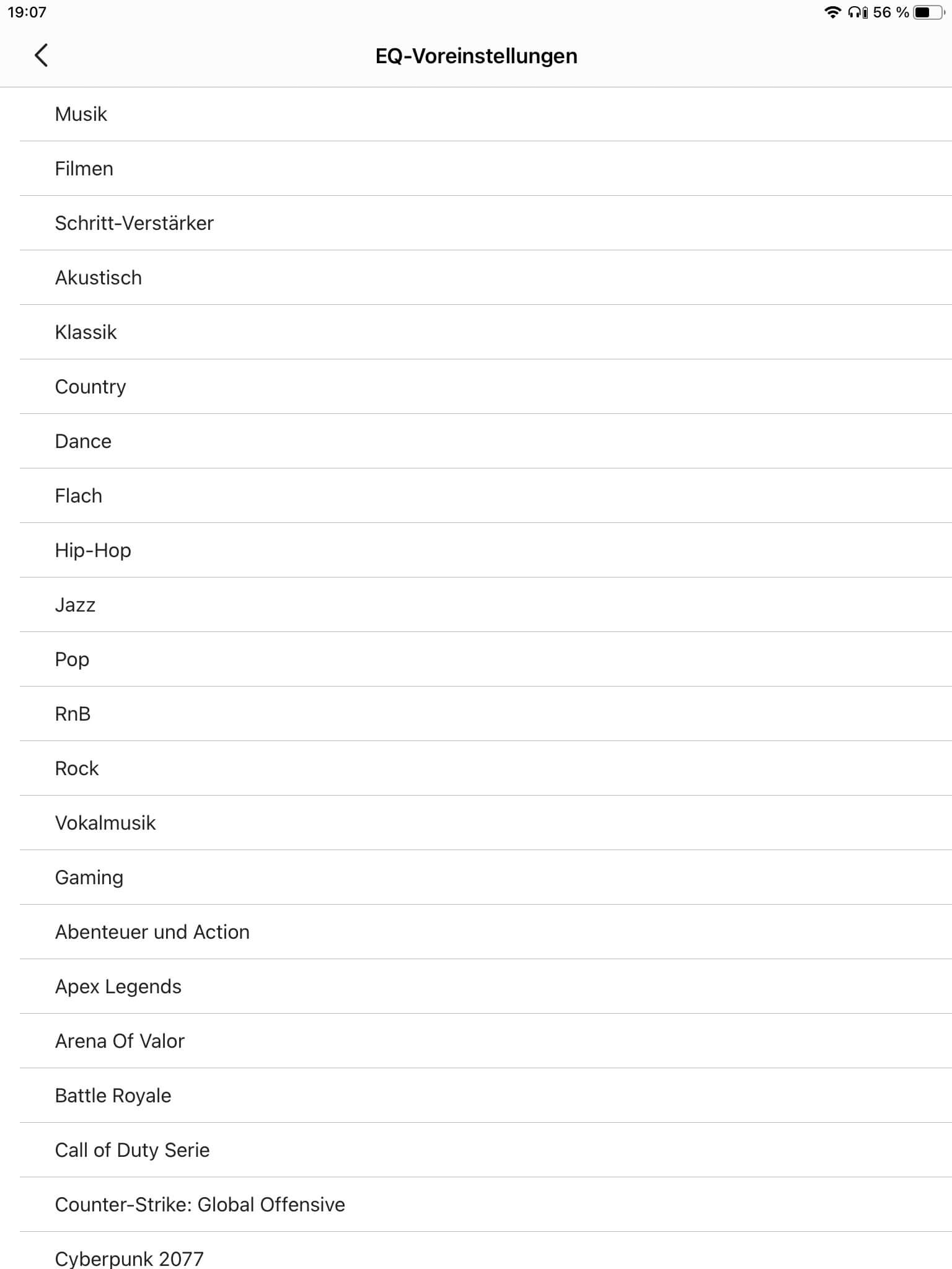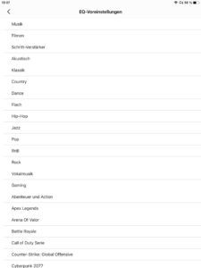 Über die App-Anbindung der Outlier Air V3 (Android, iOS, Windows und macOS) steht ein grafischer EQ mit zehn Bändern für die Klanganpassung zur Verfügung, wobei eigene Einstellungen als Presets speicherbar sind. Darüber hinaus stehen 43 vorgefertigte EQ-Settings zur Auswahl, die eine Vielzahl an Musikstilen von „Hip-Hop“ bis „Klassik“ sowie spezifische Einstellungen für einzelne Computer- und Videospiele wie „League of Legends“, „Fortnite“ oder die Serie „Call of Duty“ umfasst. Per „RPG“ oder „Fahrsimulation“ werden zudem verschiedene Genres anvisiert. Gut umgesetzt ist hierbei, dass die Settings als Grundlage für eigene Anpassungen genutzt werden können.