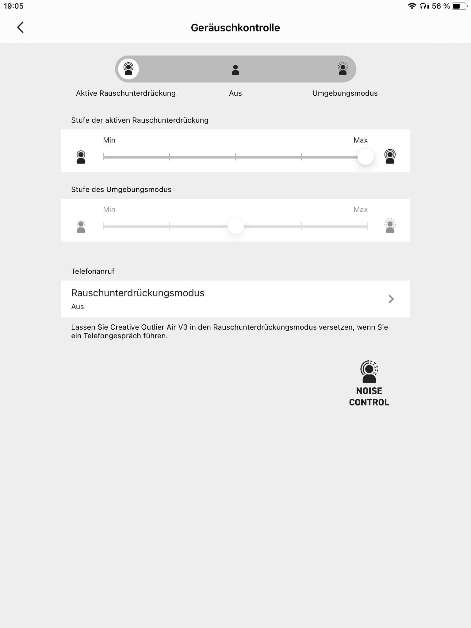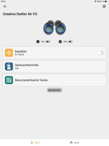 Neben der Belegung der Touch-Steuerung lässt sich per App die Geräuschkontrolle der Creative Outlier Air V3 einstellen, indem sowohl das Noise Cancelling als auch der Umgebungsmodus in fünf Stufen an die Umgebung angepasst werden kann. Ebenfalls konfigurierbar ist, ob die Geräuschunterdrückung oder der Umgebungsmodus bei Telefonaten aktiv sei soll. Des Weiteren besteht die Möglichkeit, die Hörer mithilfe von Firmware-Updates zu aktualisieren.