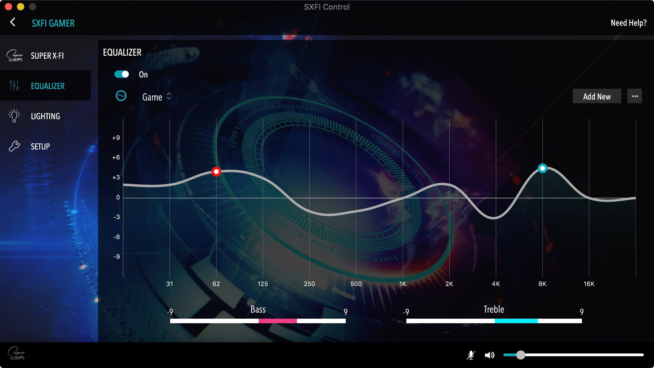 Mit der kostenlosen Software „SXFI Control“ für Windows und macOS besteht die Möglichkeit, gezielt in das Klang- und Leuchtverhalten einzugreifen. Dabei ist das Programm in vier Bereiche unterteilt. Im ersten Reiter „Super X-Fi“ könnt ihr sodann ein SXFI-Konto erstellen oder euch – falls schon geschehen – bei diesem anmelden, was nötig ist, um eure personalisierten Super X-Fi-Profile (dazu später mehr) zu laden. Im Abschnitt „Equalizer“ passt ihr mit einem 10-Band-Equalizer die Klangeigenschaften des Headsets an. Natürlich stellt Creative auch Presets bereit („Cinema“, „Flat“, „Game“, etc.), aber auch eigene können angelegt und gespeichert werden. Wer von euch nur mal eben schnell Bässe oder Höhen bearbeiten will, kann dafür die beiden unteren Schieberegler „Bass“ und „Treble“ nutzen.