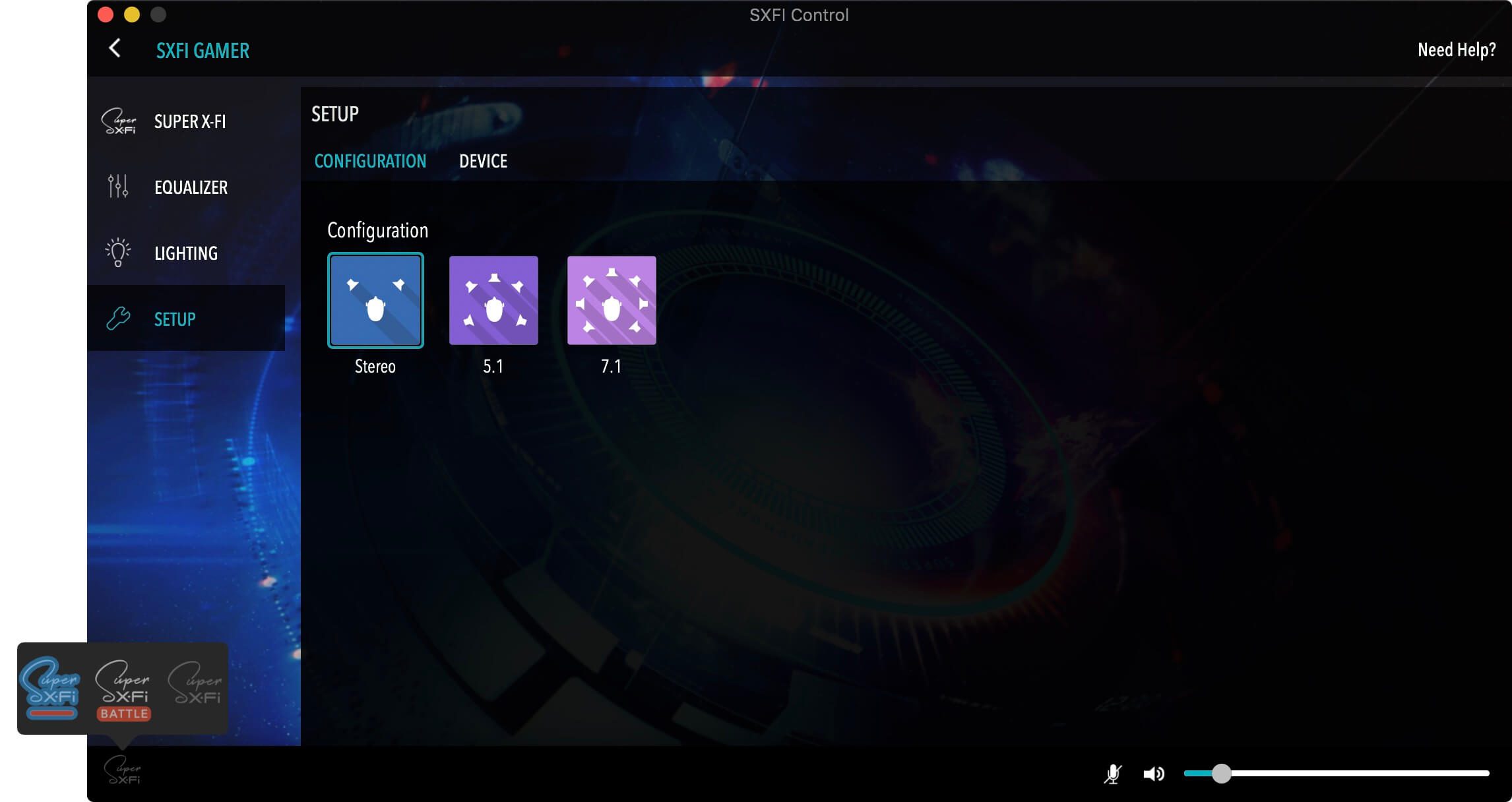 Der letzte Reiter „Setup“ kümmert sich um verschiedene Sound-Einstellungen. Neben der Lautsprecherkonfiguration („7.1“, „5.1“ oder „Stereo“), schaltet hier ihr noch das Mikrofon stumm, regelt dessen Lautstärke oder de/aktiviert den sogenannten „Battle Mode“ sowie den Super-X-Fi-Modus.