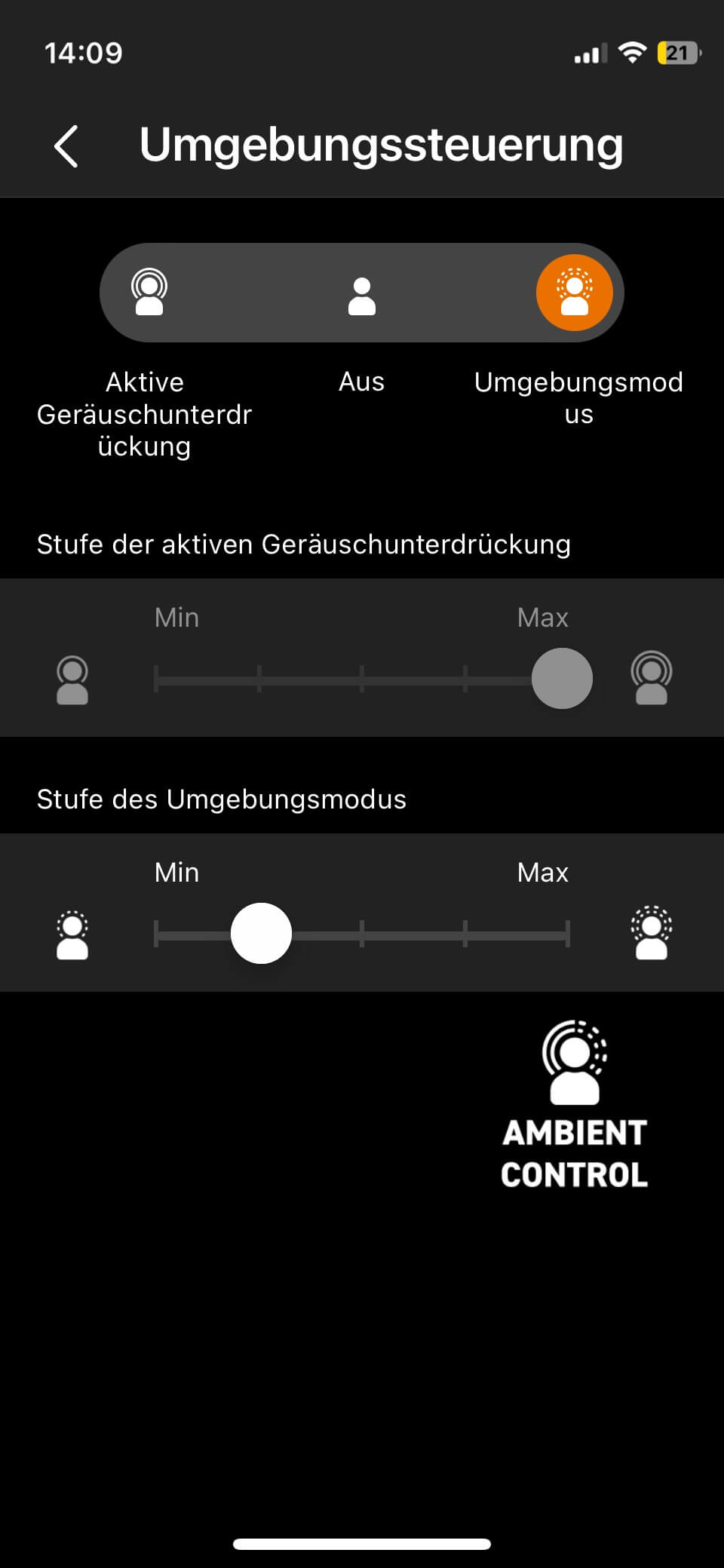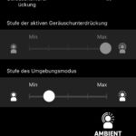 Für die aktive Geräuschunterdrückung nutzen die Ohrhörer vier der sechs verbauten Mikrofone, die Dämpfung lässt sich in fünf Stufen einstellen. In der Praxis ist das Ergebnis ordentlich, wobei die Abstufung nur bedingt Sinn macht – entweder ganz oder gar nicht, mehr braucht es eigentlich nicht. Die Dämpfung des ANC wirkt vor allem im Bereich der unteren Mitten sowie im Bass: Oben herum passiert sehr viel weniger, sodass hochfrequente Umgebungsgeräusche weiterhin wahrnehmbar sind – man wird also nur teilweise von der Welt entkoppelt. Im Ambient/Transparenz-Modus schalten die Ohrhörer hingegen auf Durchzug, sodass man sein Umfeld abhängig von der Dämpfungsstufe deutlich wahrnimmt. Als Begleiterscheinung steigt auch das Grundrauschen, das sich speziell im Mittenbereich relativ prominent präsentiert – damit kann man jedoch gut leben.