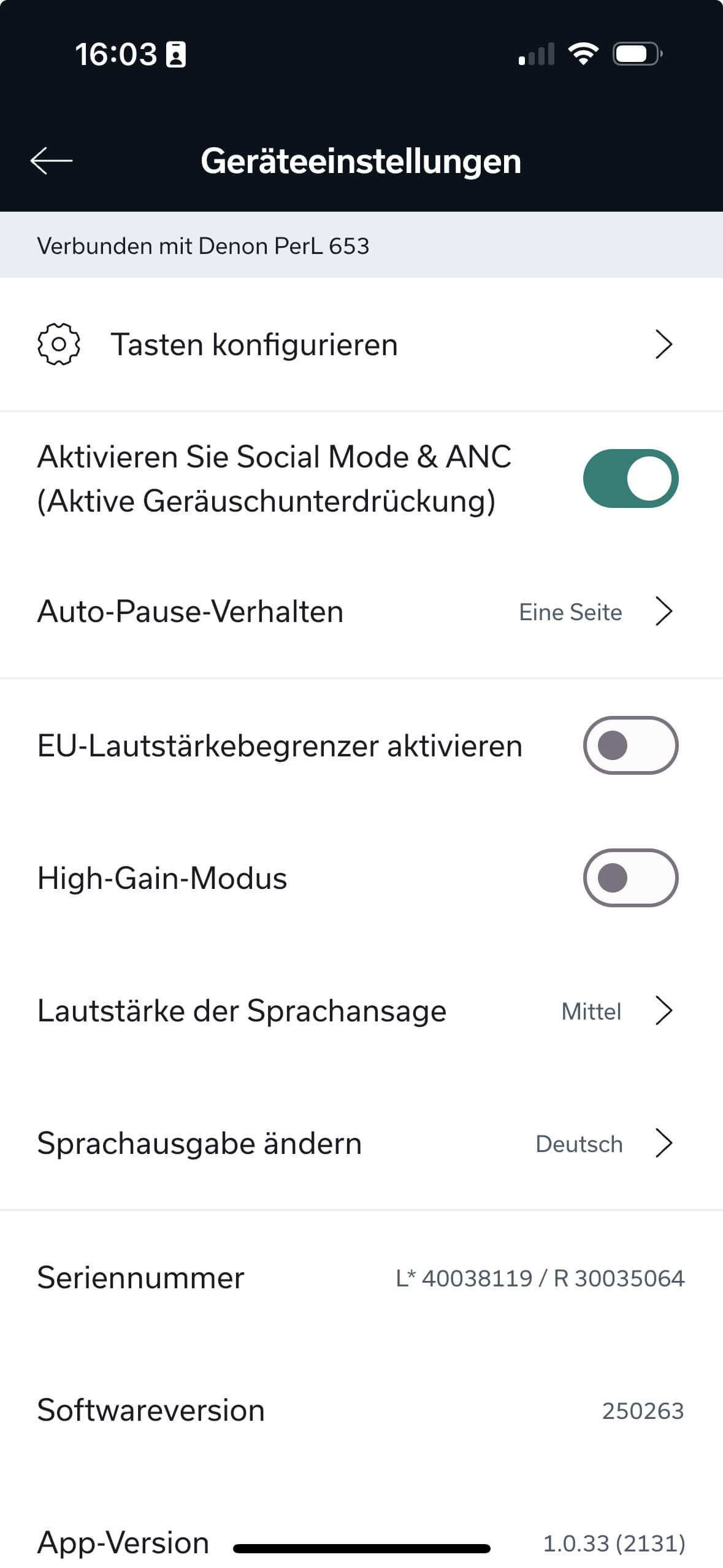 Der Social- oder auch Transparenz-Modus arbeitet ebenfalls sehr effektiv, wobei Denon die Abstimmung vor allem auf Verkehrssicherheit getrimmt hat. Bei Aktivierung wird das Nutzsignal etwas heruntergeregelt und das Außensignal mit einer hohen Sprachverständlichkeit durchgelassen, was ich im Alltag als sehr nützlich empfunden habe.