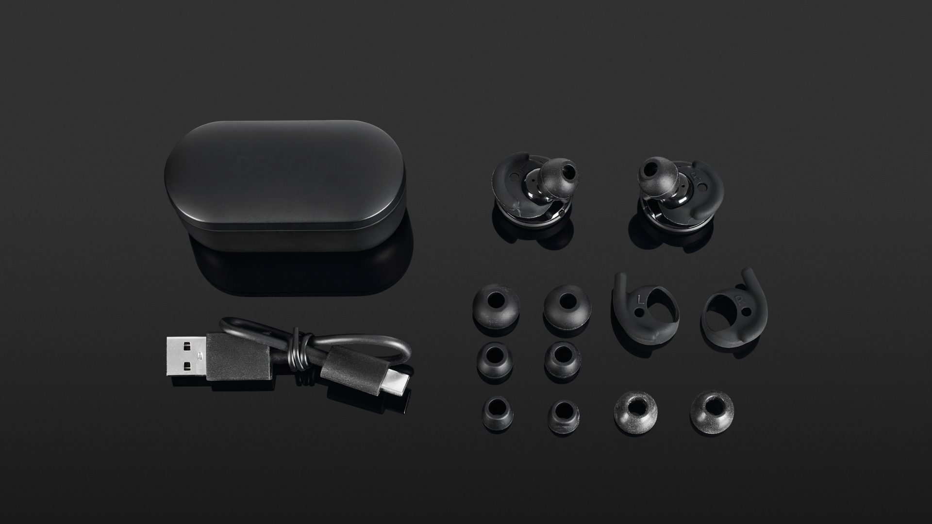 Neben einem sehr kurzen USB-A auf -C-Ladekabel liefert Denon vier Paar Ear-Tips (XS, S, M und L) sowie ein Memory-Foam-Tip in mittlerer Größe, den ich dann auch gleich gegen den Ms des Auslieferungszustands ausgetauscht habe. Zudem gibts je eine Gummi-Finne, welche die „Arretierung“ je nach Ohranatomie erleichtern kann, aber nicht muss. Meine Ohren zum Beispiel brauchen nur Eartips in M – und sonst nichts.