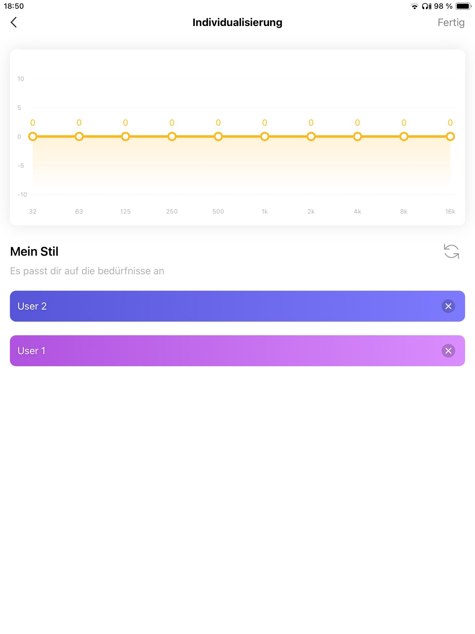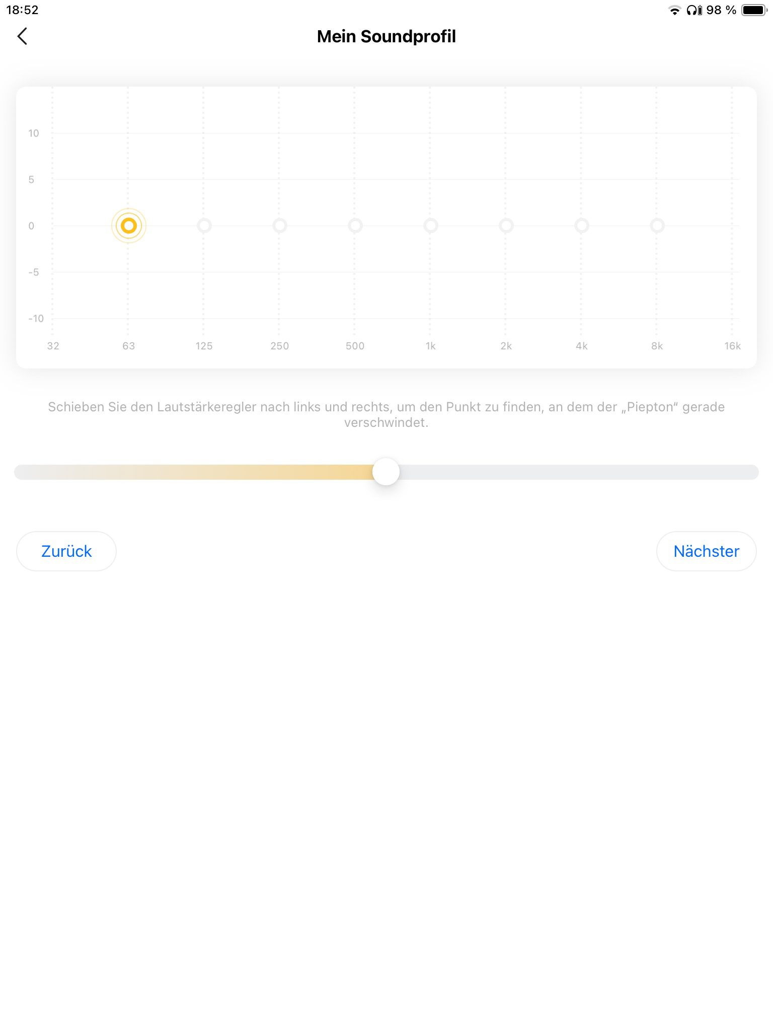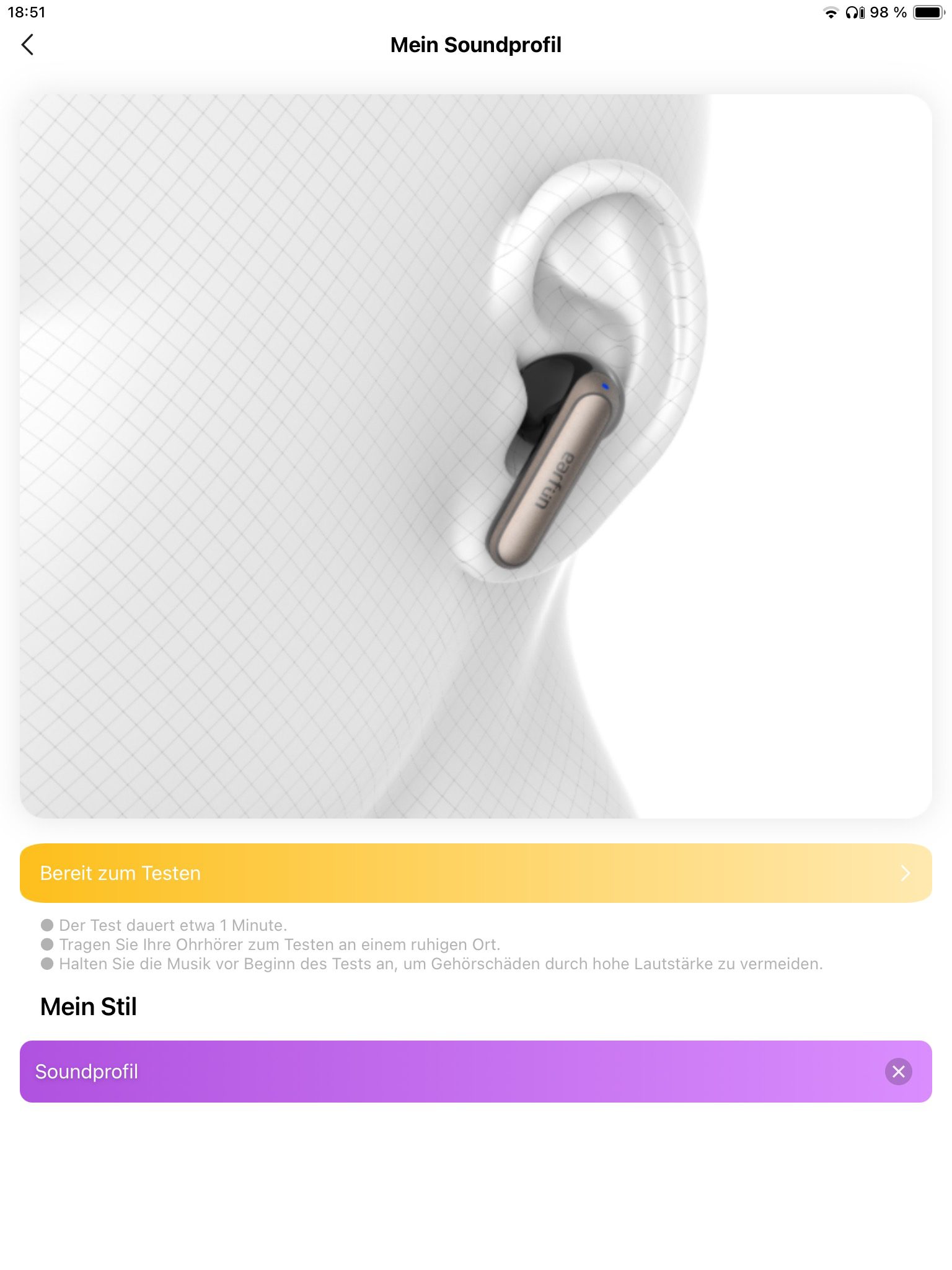 Über die Geräuschkontrolle der App-Anbindung (Android und iOS) besteht Zugriff auf einen allgemeinen Transparenzmodus, eine Windgeräuschunterdrückung für Outdoor-Aktivitäten und zwei ANC-Betriebsarten, wovon sich eine nach einer kurzen Analyse automatisch an den Gehörgang anpasst. Ein weiteres zentrales Element stellt die EQ-Sektion mit einer umfangreichen Auswahl an vorkonfigurierten Settings dar. Diese umfasst 14 Optionen zur Anhebung oder Absenkung von Bässen, Mitten und Höhen in unterschiedlichen Abstufungen sowie 15 genrespezifische Anpassungen für Hip-Hop, Rock oder Pop. Ergänzend können über einen EQ mit zehn Bändern eigene Einstellungen vorgenommen werden, die als Presets speicherbar sind. Wer möchte, hat zudem die Möglichkeit, einen Hörtest zu absolvieren, um ein persönliches Soundprofil zu erstellen. Momentan wirken die Ergebnisse allerdings noch ziemlich basslastig und dumpf, was hoffentlich bald durch ein Update behoben wird.