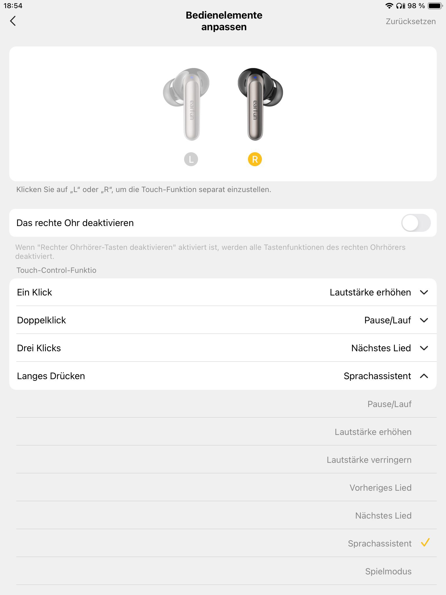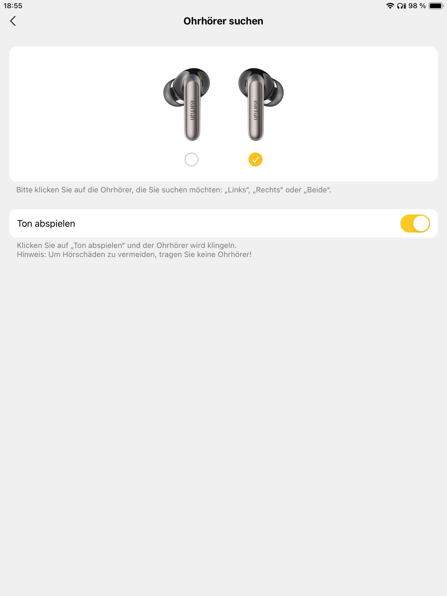 Neben der Touch-Steuerung lassen sich über die App auch ein Timer und die Lautstärke der Sprachansagen konfigurieren. Darüber hinaus können Multipoint-Verbindungen sowie der Gaming- und Theatermodus ein- oder ausgeschaltet werden. Außerdem sind noch Firmware-Aktualisierungen durchführbar, während eine Suchfunktion per Piepton beim Auffinden der Hörer behilflich sein kann. Auf Android-Geräten lässt sich zudem der LDAC-Codec aktivieren, wenn dieser vom Smartphone oder Tablet unterstützt wird.