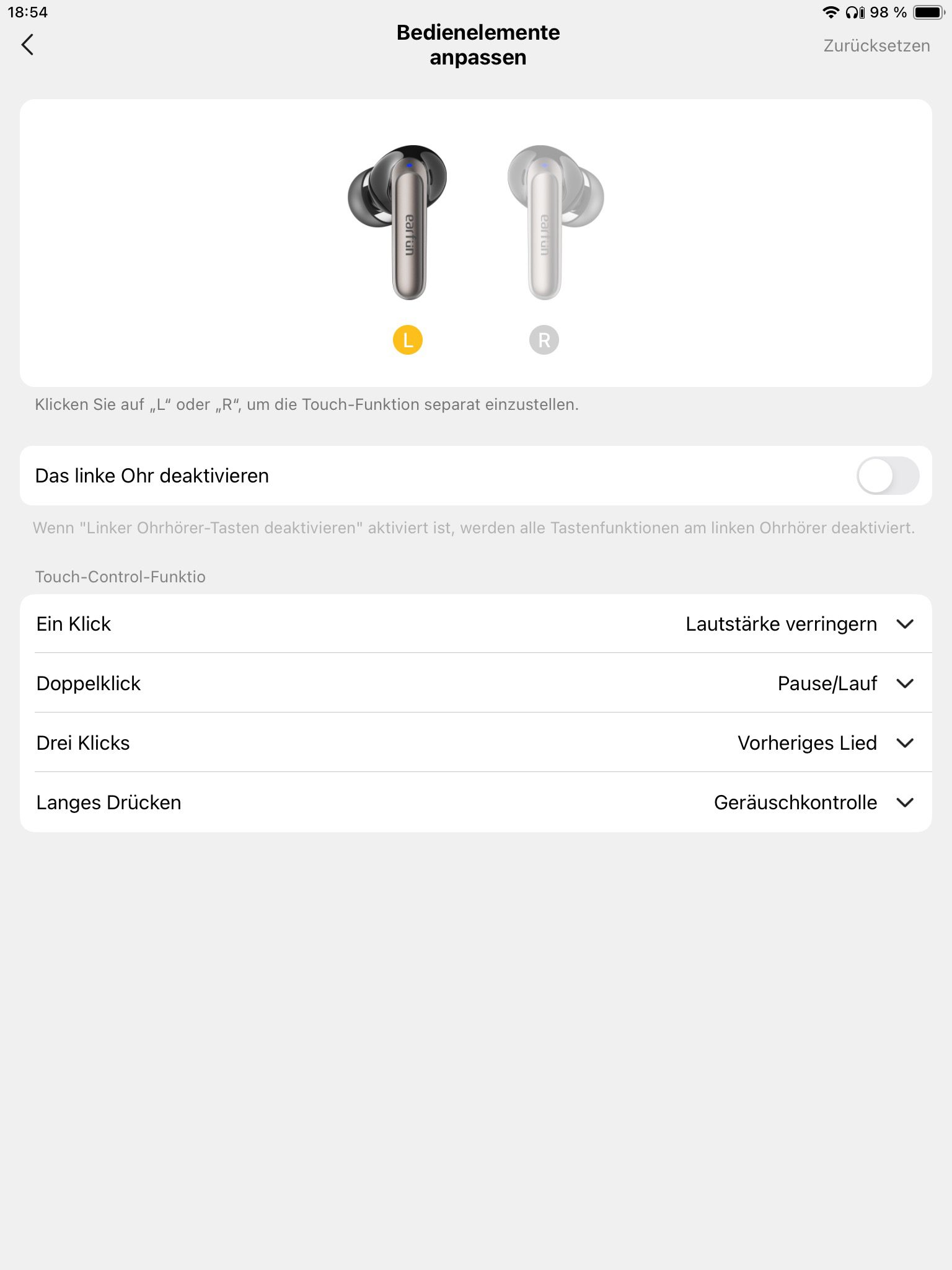 Die EarFun Air 2 NC verfügen über berührungsempfindliche Oberflächen, um die Wiedergabe zu steuern, Telefonate abzuwickeln und die Lautstärke zu regeln. Darüber hinaus kann zur Titelauswahl vor- und zurückgesprungen oder der Sprachassistent aufgerufen werden. Ein Umschalten zwischen Grund-, ANC- und Transparenzmodus ist ebenfalls möglich. Weitere Optionen wie eine Wahlwiederholung oder der Gaming-Modus sind über die App auswählbar, zumal sich die Touch-Oberflächen bei Bedarf deaktivieren lassen. Nicht unterstützt wird dagegen ein manuelles Ein- und Ausschalten. Allerdings sind die In-Ears einseitig im Single-Betrieb nutzbar.