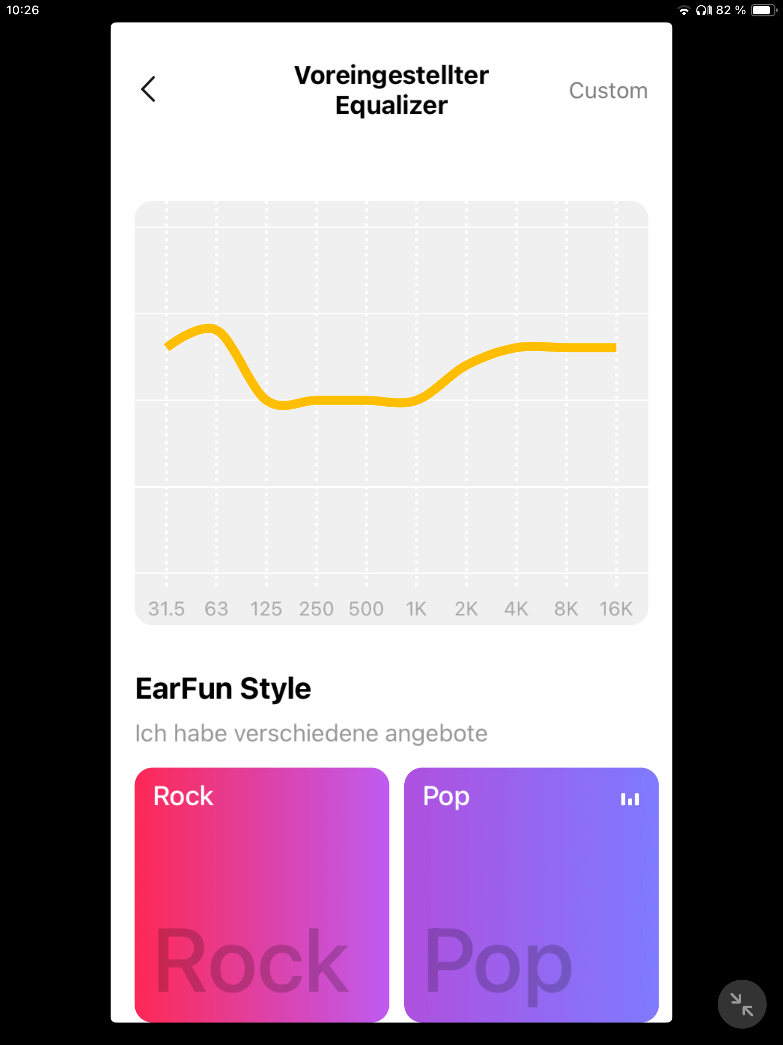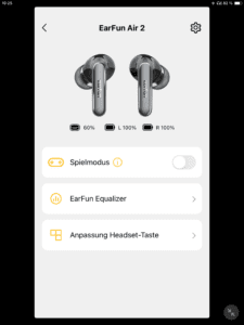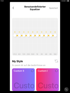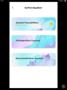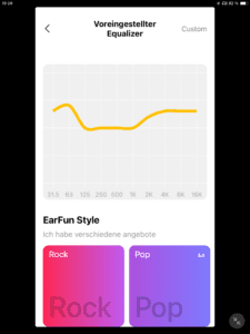 Zur Klanganpassung der EarFun Air 2 stellt die App-Anbindung (Android und iOS) mit „Rock“, „Pop“, „Country“, „R&B“, „Classical“, „Jazz“, „Bassanhebung“, „Bassabsenkung“, „Höhenanhebung“ und „Höhenabsenkung“ zehn vorgefertigte Settings zur Auswahl. Über einen EQ mit zehn Bändern lassen sich zudem eigene Einstellungen vornehmen, die als Presets gespeichert werden können, was prima gemacht ist.
