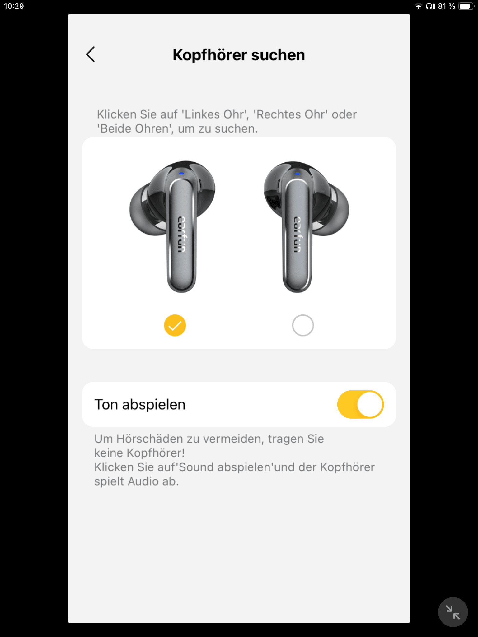 Über die App kann neben der Touch-Steuerung auch die Mikrofontechnik für den Single-Betrieb konfiguriert werden. Darüber hinaus lassen sich Multipoint-Verbindungen und der latenzreduzierte Gaming-Modus ein- oder ausschalten sowie Firmware-Aktualisierungen vornehmen. Während eine Suchfunktion per Piepton beim Auffinden der Hörer behilflich sein kann, besteht ergänzend noch die Option, die Lautstärke der Sprachansagen einzustellen. Auf Android-Geräten lässt sich zudem der LDAC-Codec aktivieren, wenn dieser vom Smartphone oder Tablet unterstützt wird.