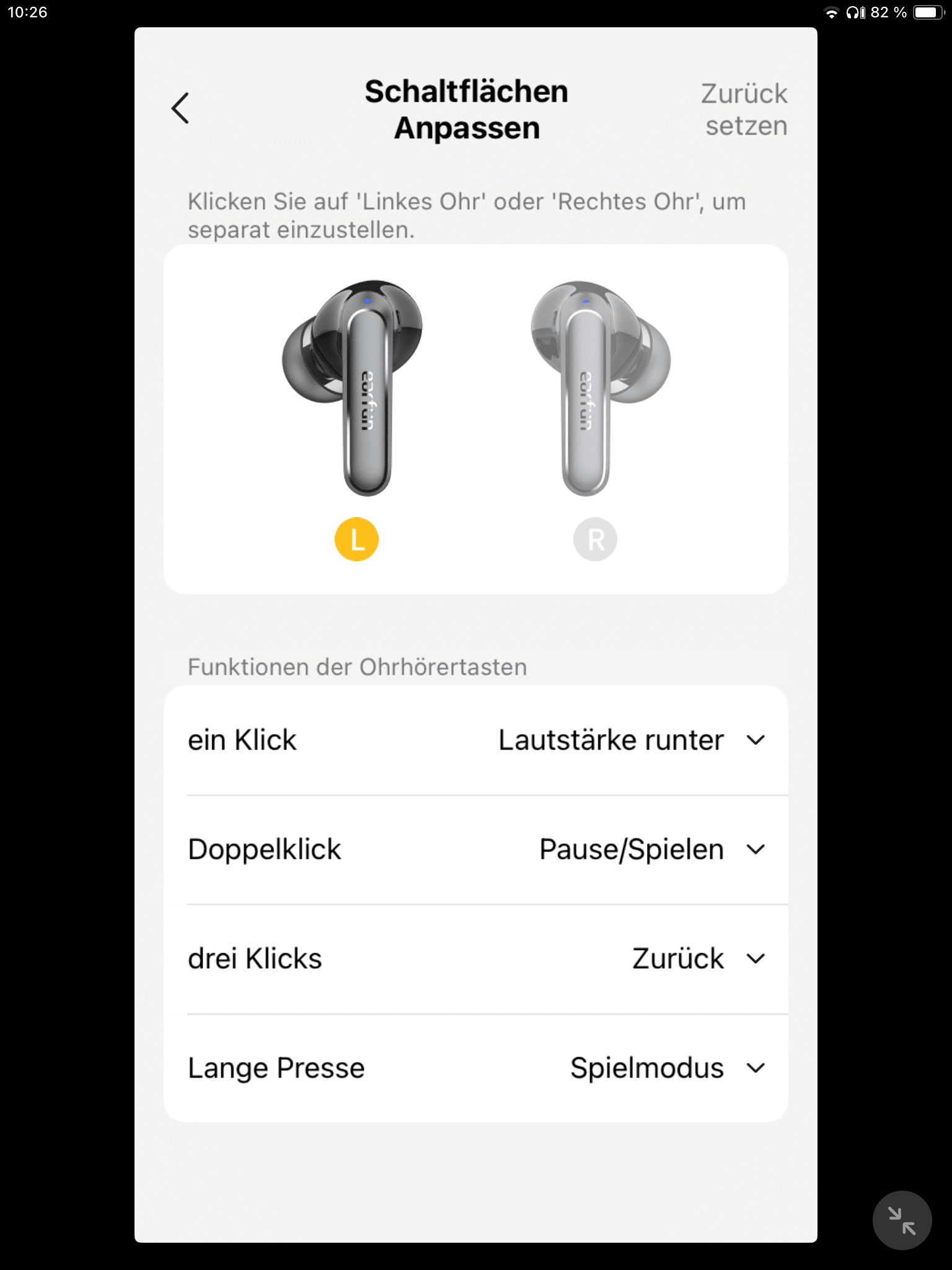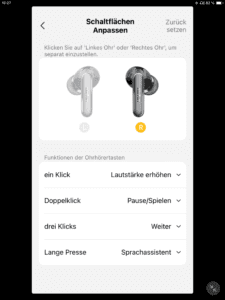 In der Werkseinstellung lassen sich über die berührungsempfindliche Höreroberflächen die Wiedergabe steuern, zur Titelauswahl vor- und zurückspringen, die Lautstärke regeln und der Sprachassistent aufrufen. Darüber hinaus können Anrufe angenommen und beendet werden. Vorbildlich ist, dass die Touch-Steuerung über die App an die persönlichen Vorlieben angepasst werden kann. Wer möchte, hat die Option auch den Gaming-Modus direkt über die Hörer zu (de-)aktivieren. Was hingegen nicht unterstützt wird, ist ein manuelles Ein- und Ausschalten der Hörer über die Touch-Oberflächen, wodurch das Case stets benötigt wird.