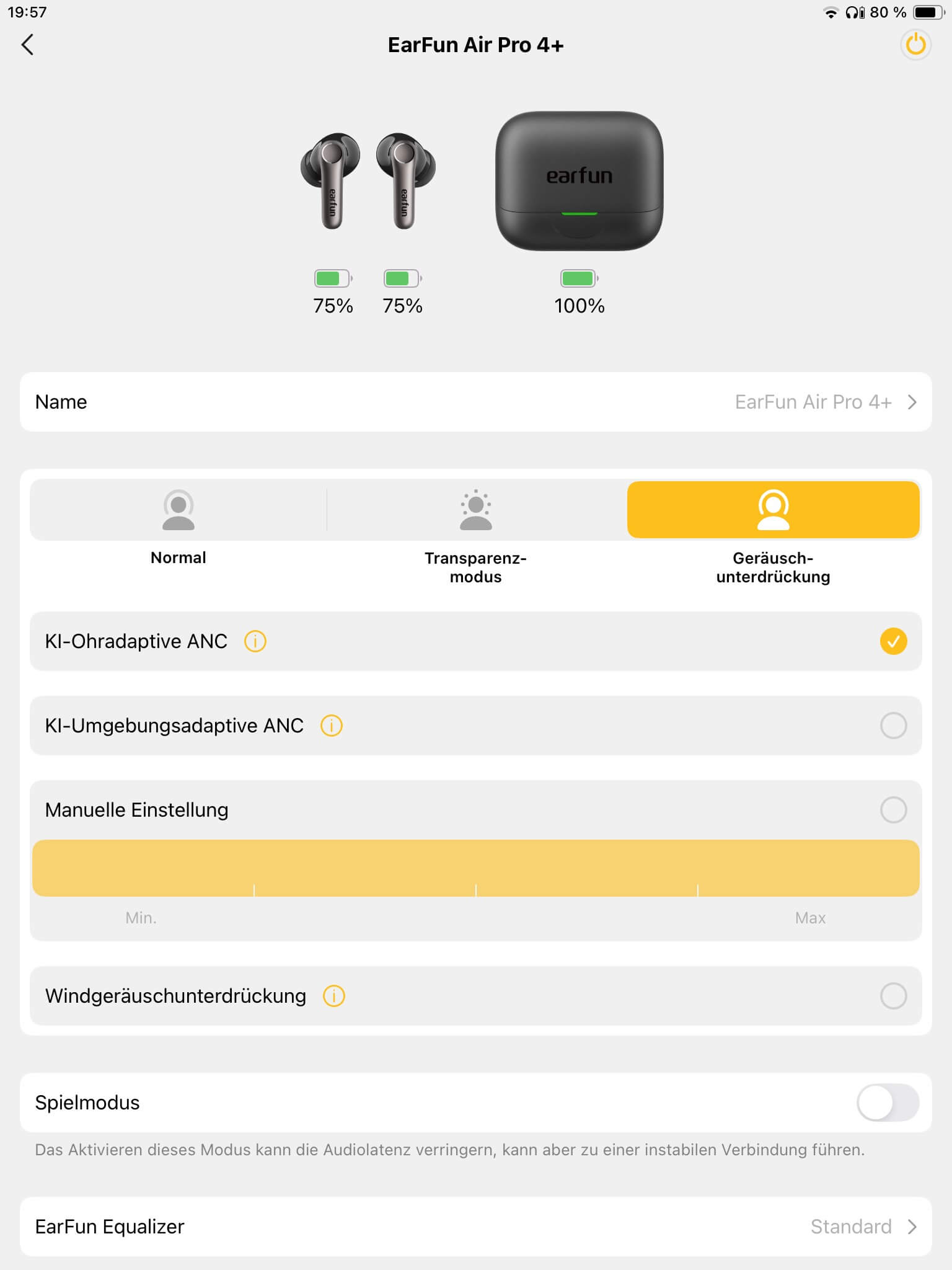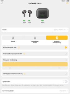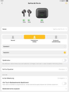 Die Geräuschkontrolle der EarFun Air Pro 4+ unterteilt sich mit „Standard“ und „Natürlich“ in zwei Transparenzmodi und insgesamt vier ANC-Betriebsarten. Diese setzen sich aus einer Windgeräuschunterdrückung, einem manuellen Modus mit vier Intensitätsstufen und zwei adaptiven Varianten zusammen.