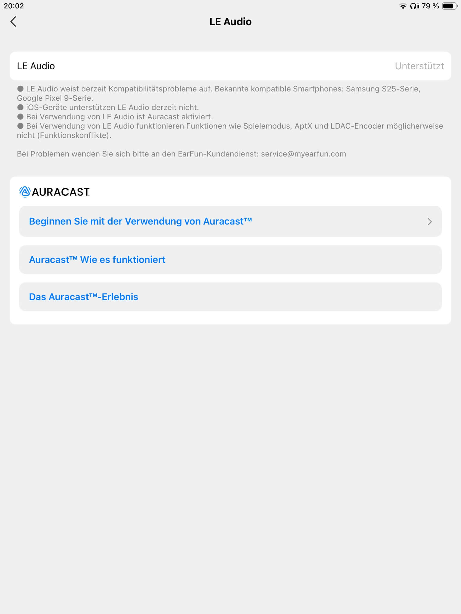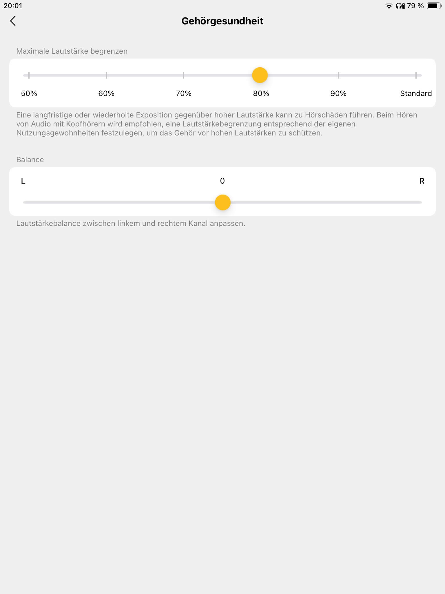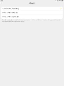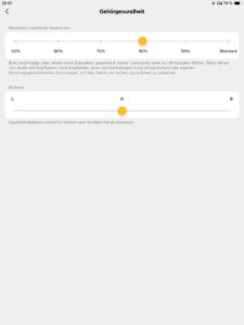 Eine Gehörschutzfunktion erweitert die App um eine fünfstufige Lautstärkebegrenzung und einen Balance-Regler. Außerdem lassen sich Mikrofoneinstellungen und Sprachansagen konfigurieren, kann nach einem Broadcast Stream gesucht und die Firmware aktualisiert werden.