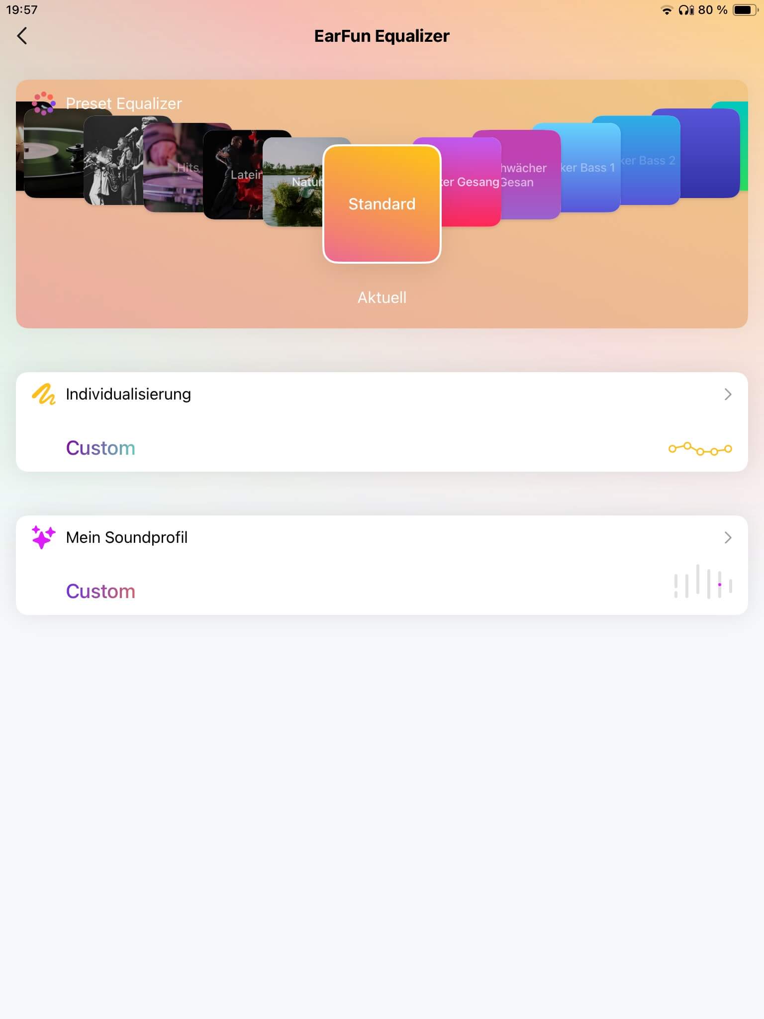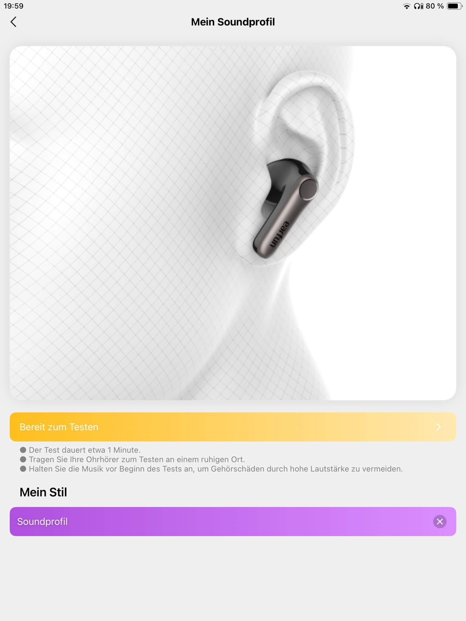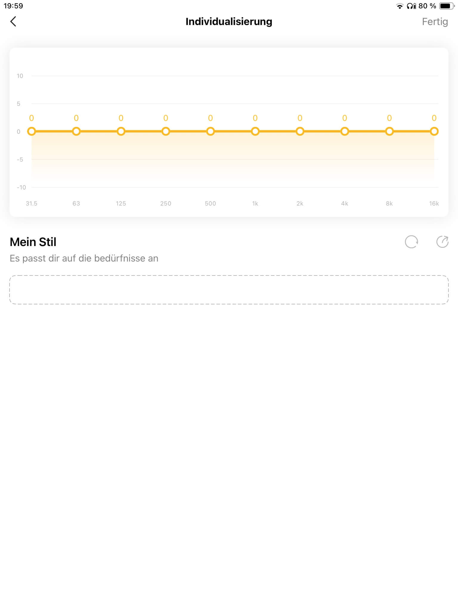 Über die EQ-Sektion der App-Anbindung (Android/iOS) stehen zehn Bänder für eigene Klanganpassungen und 29 Voreinstellungen bereit. Optional kann noch ein Hörtest absolviert werden, um ein persönliches Soundprofil zu generieren. Da die Ergebnisse sehr basslastig ausfallen, ist davon aktuell allerdings abzuraten.