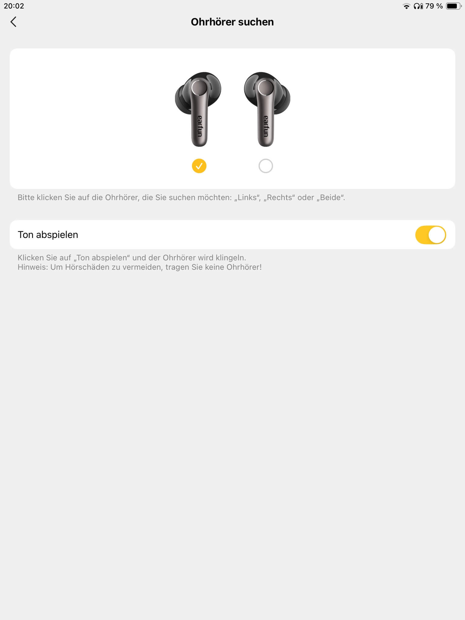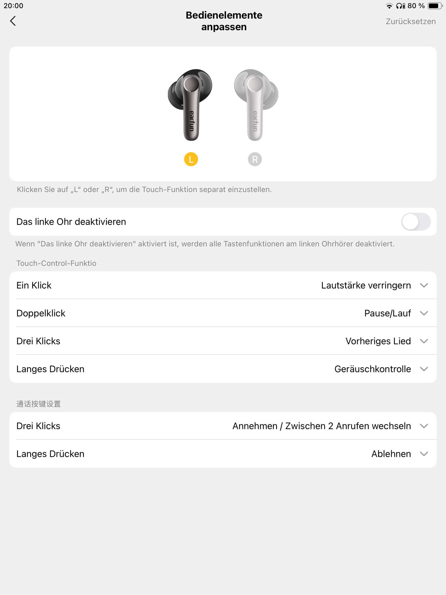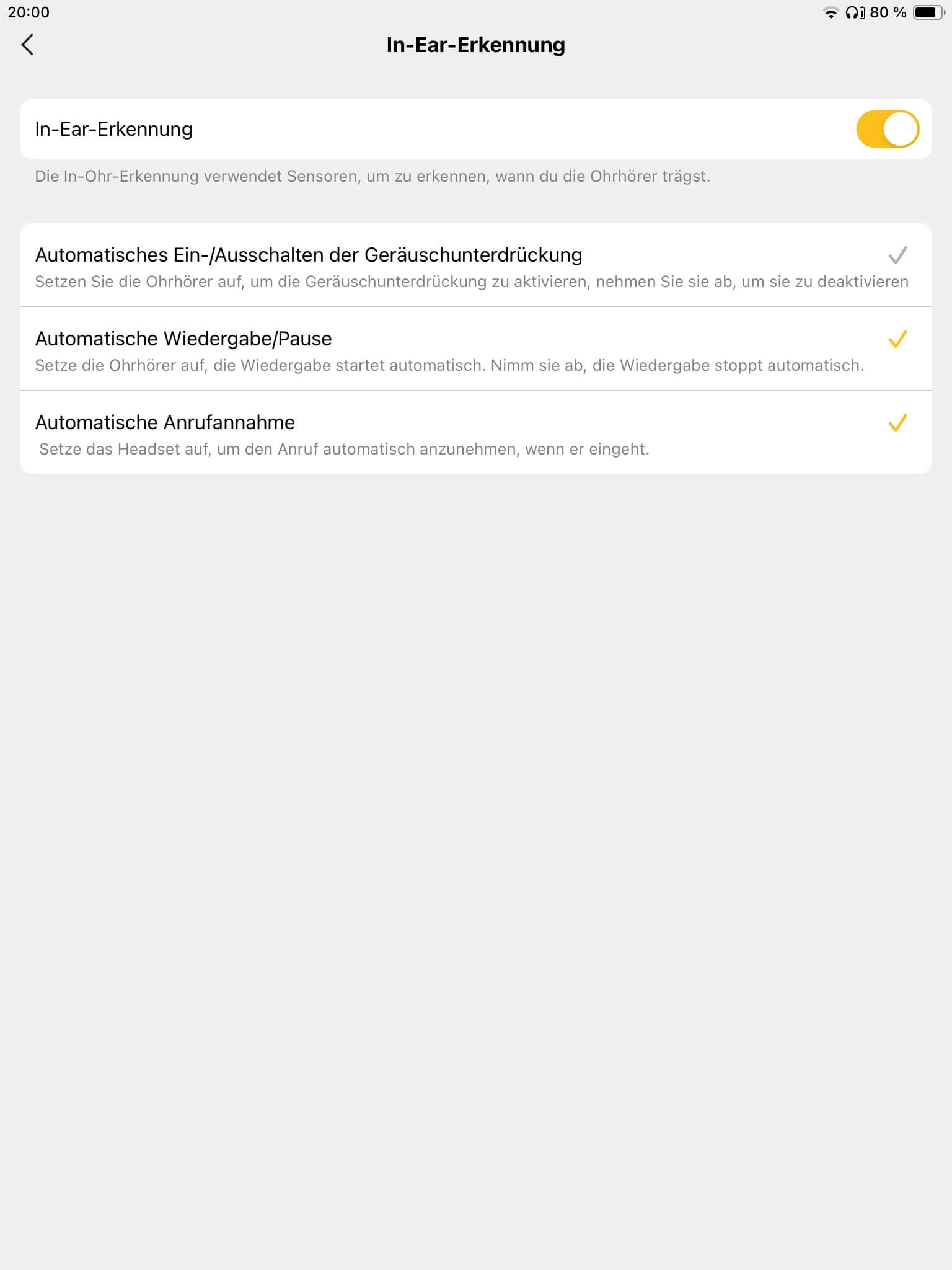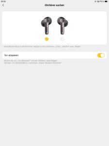 Nach Bedarf (de-)aktivierbar sind darüber hinaus Trageerkennung und Multipoint-Verbindungen sowie der Gaming-Modus. Auch eine Suchfunktion ist vorhanden, die per Piepton beim Auffinden der Hörer behilflich sein kann. Auf Android-Geräten lassen sich zusätzlich noch die Audiocodecs aptX, aptX Adaptive, aptX Lossless und LDAC einrichten.