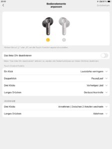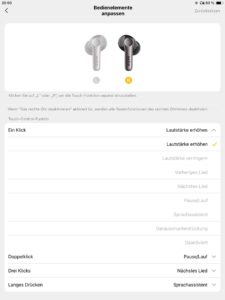 Ansonsten ist ein Steuern der Wiedergabe, das Abwickeln von Telefonaten, eine Lautstärkeregelung und Titelnavigation sowie das Umschalten zwischen ANC-, Transparenz- und Grundmodus vorgesehen. Auch der Sprachassistent lässt sich aktivieren. Vermisst werden kann jedoch ein manuelles Ein- und Ausschalten der In-Ears autark vom Lade-Case.