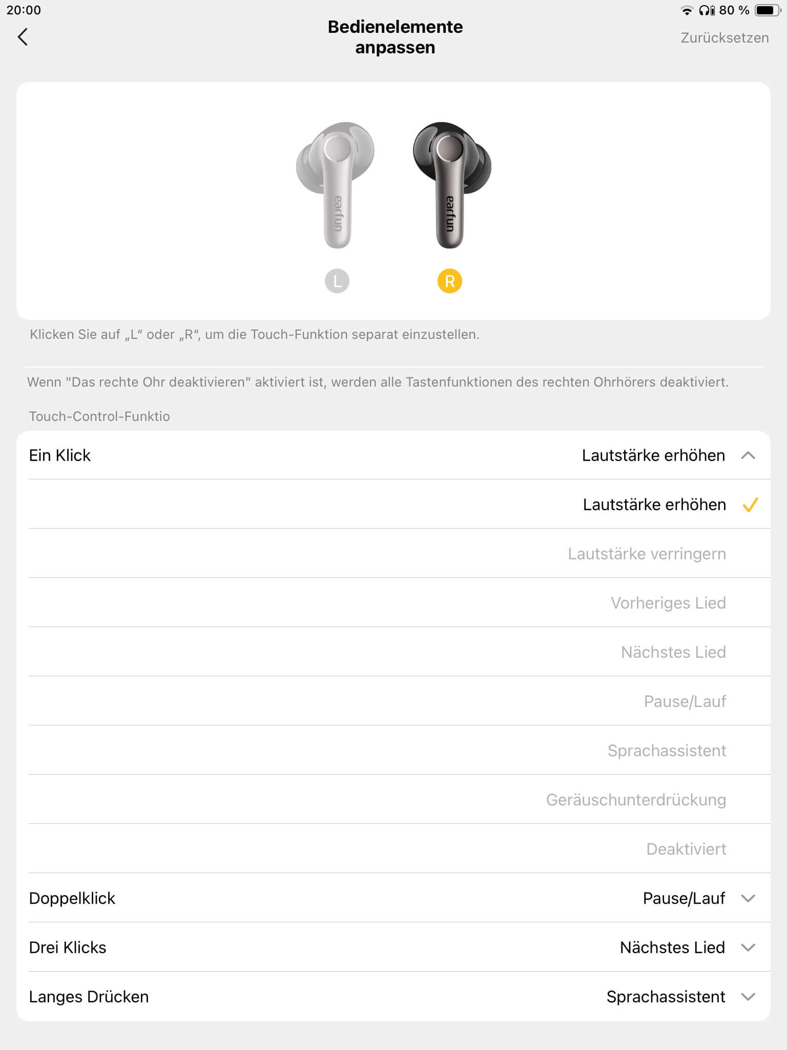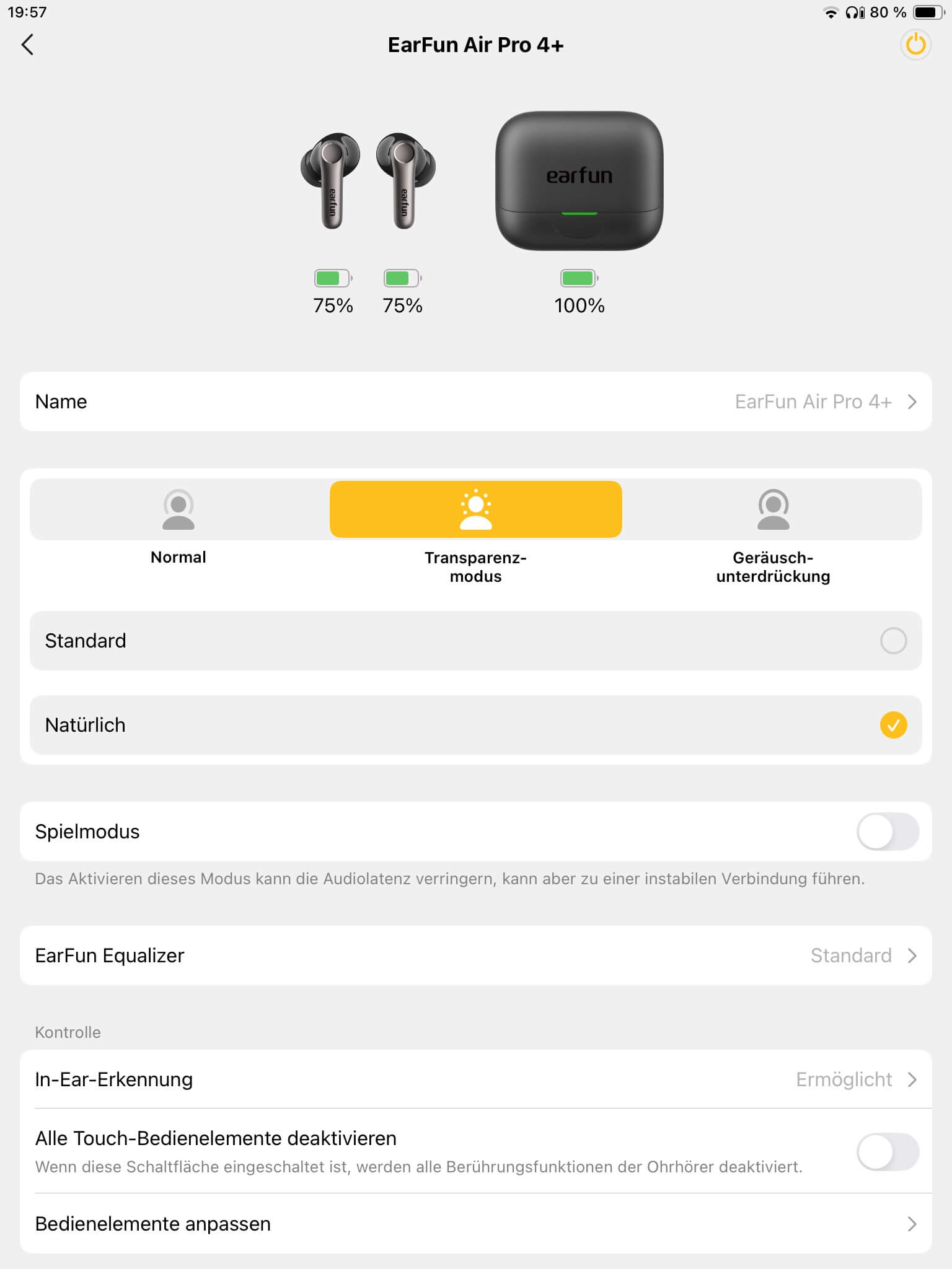 Die funktionale Touch-Steuerung der EarFun Air Pro 4+ kann per App an die eigenen Vorlieben angepasst werden. Konfigurierbar sind ein- bis dreifaches Antippen plus Halten pro Seite. Was im Vergleich zu den EarFun Air Pro 4 fehlt, ist der Gaming-Modus.