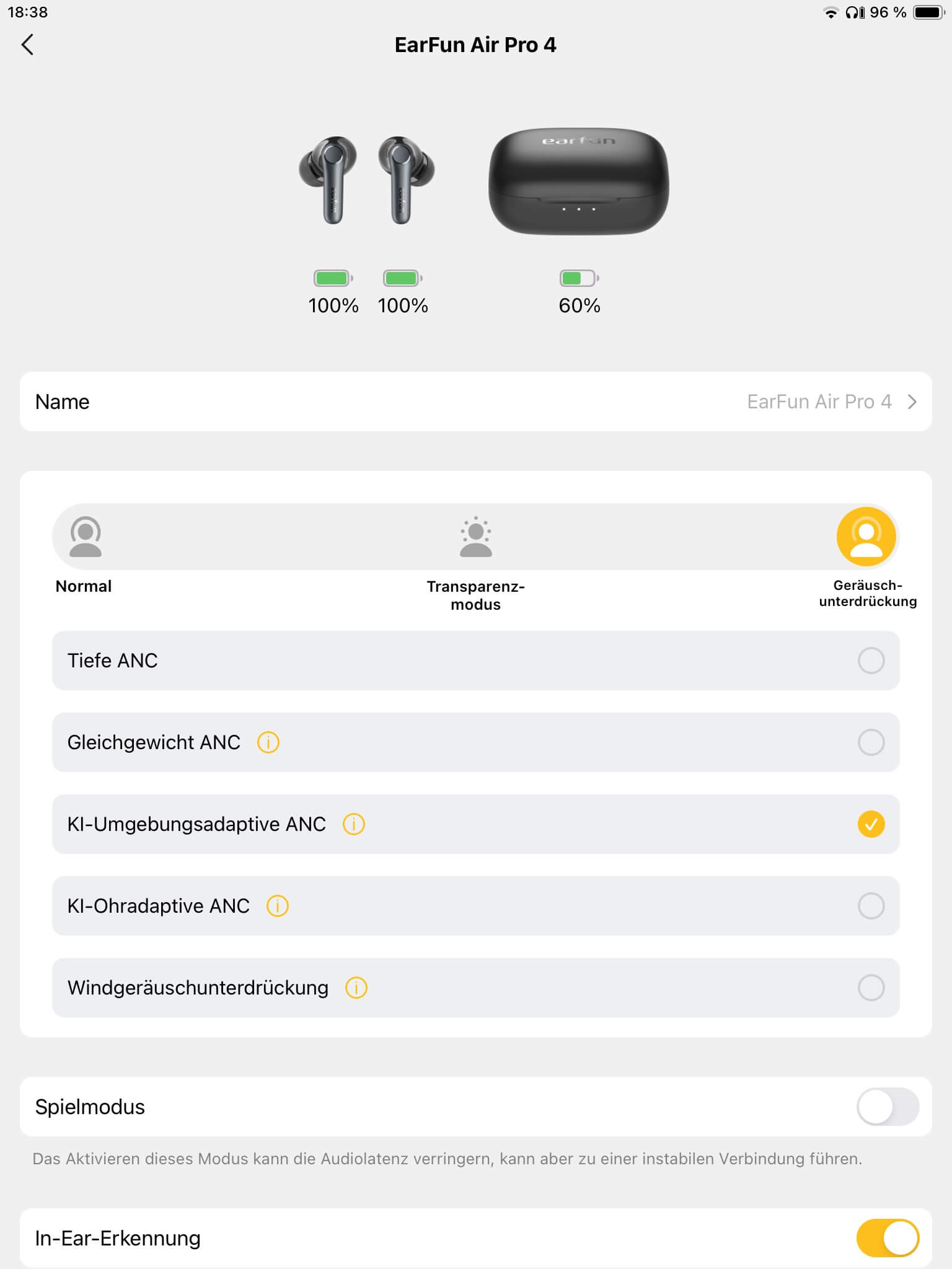Über die Geräuschkontrolle der App-Anbindung (Android und iOS) stehen ein allgemeiner Transparenzmodus und insgesamt fünf ANC-Modi zur Verfügung. Dabei unterteilt sich die Geräuschunterdrückung in zwei statische sowie zwei adaptive Varianten und eine Windgeräuschunterdrückung für Outdoor-Aktivitäten.