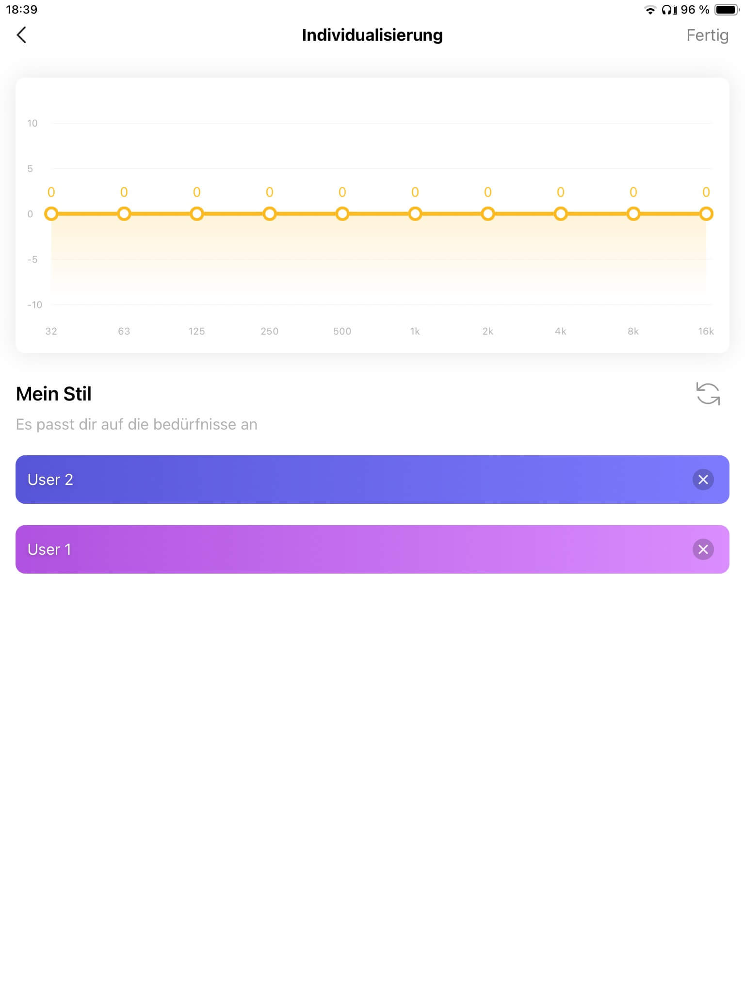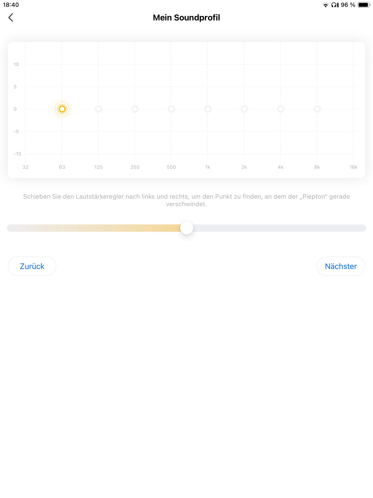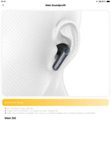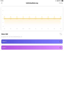 Ein EQ mit zehn Bändern dient zudem für eigene Einstellungen, die als Presets speicherbar sind. Optional kann auch ein Hörtest absolviert werden, um ein eigenes Soundprofil zu erstellen, was aktuell jedoch noch nicht richtig funktioniert. Bisher wirken die Ergebnisse ziemlich dumpf, basslastig und eindimensional, sodass der gelungene Grundklang eine wesentlich hochwertigere Wiedergabe bietet.
