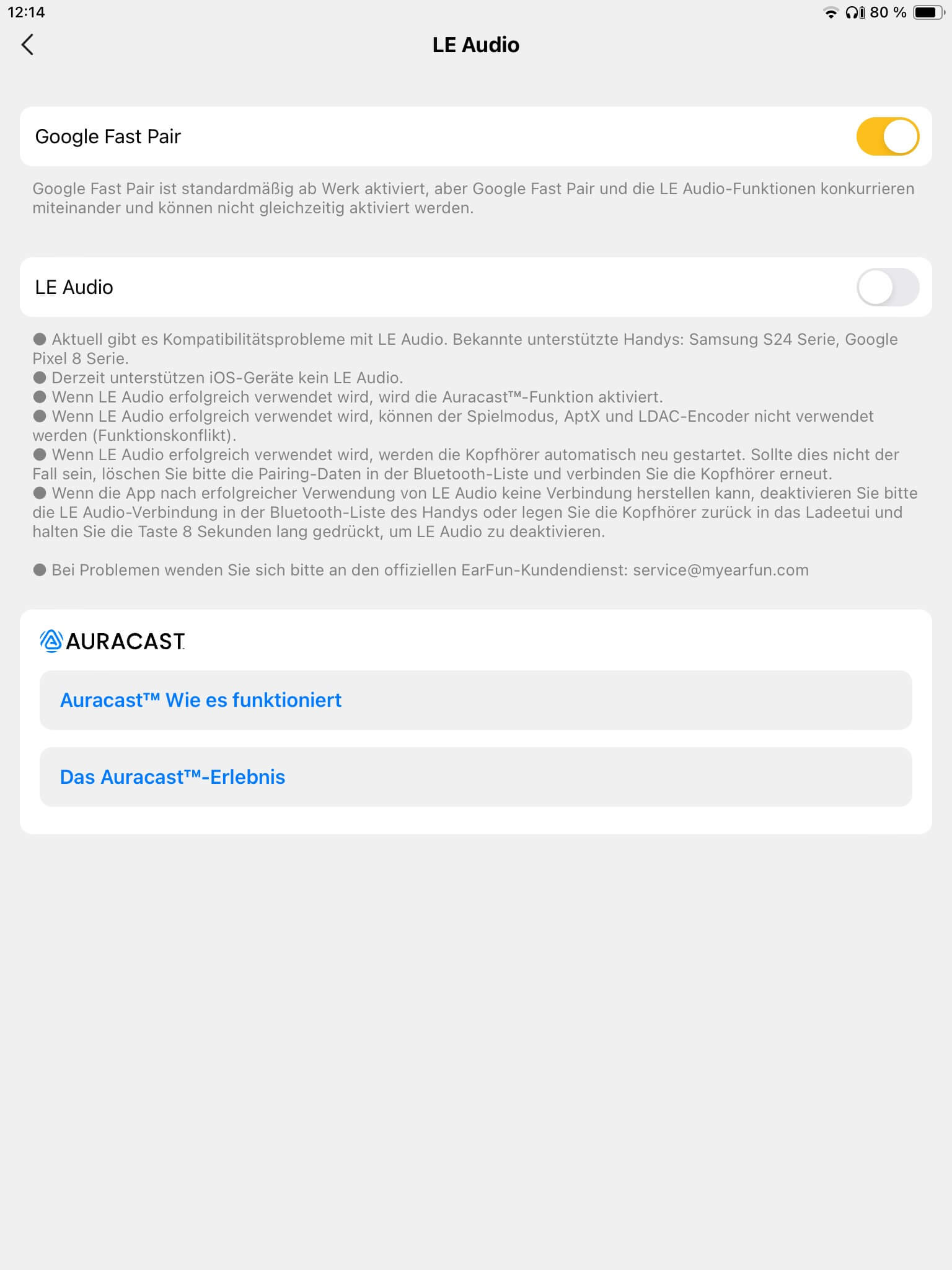 Zudem besteht die Möglichkeit, LE Audio anstelle von Google Fast Pair auszuwählen, wodurch sich die Auracast-Funktion nutzen lässt. Auf Android-Geräten sind darüber hinaus die Audiocodecs aptX, aptX Adaptive, aptX Lossless und LDAC aktivierbar.