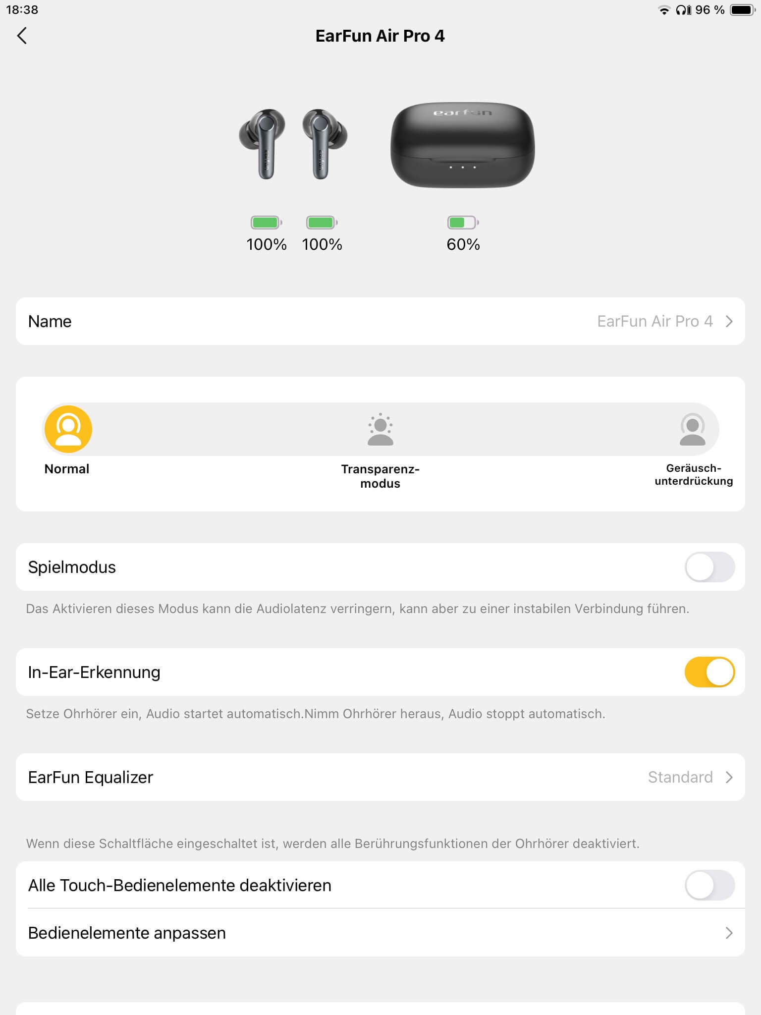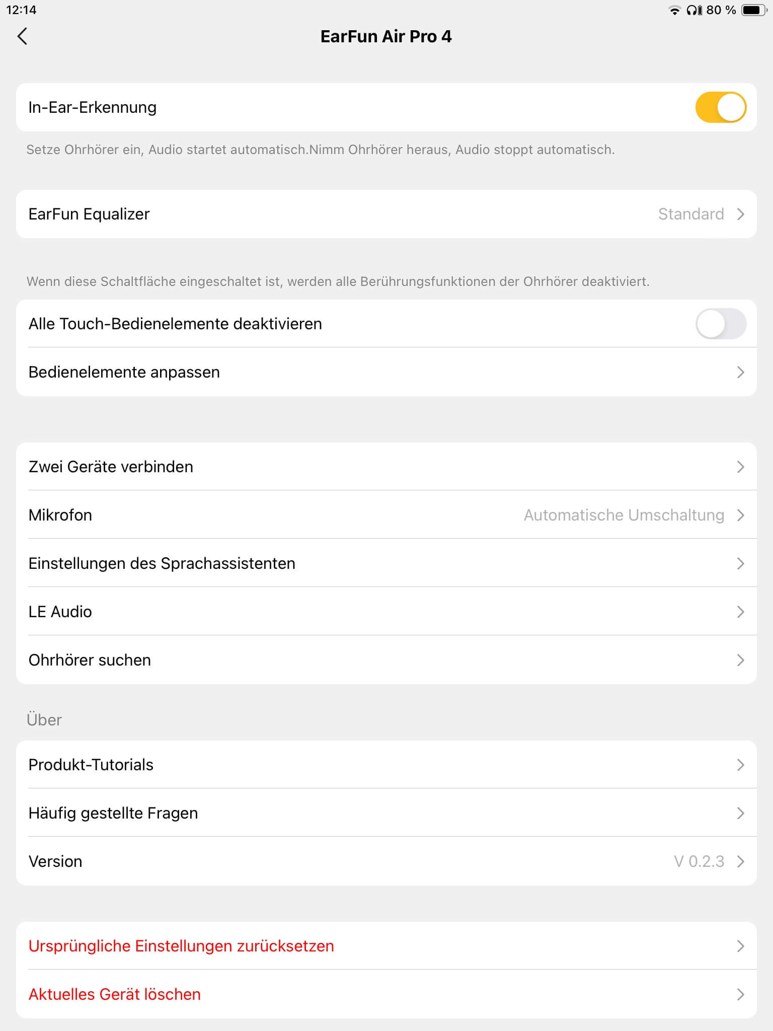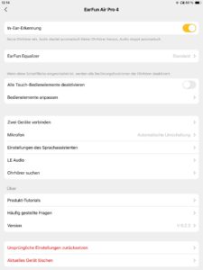 Im Vergleich zu den bereits sehr gut ausgestatteten EarFun Air Pro 3 (zum Test) hat sich auch die Auswahl an Audiocodecs erhöht. Hierbei wurde das Repertoire von SBC, LC3, AAC, aptX und aptX Adaptive noch um aptX Lossless und LDAC ergänzt. Mit Version 5.4 wird zudem der neueste Bluetooth-Standard unterstützt. Allerdings sind während der Testphase vor dem Verkaufsstart Verbindungsabbrüche bei iOS-Geräten aufgetreten. Mit der Firmware-Version 0.2.3 fällt auch die Reichweite deutlich geringer als bei Android-Geräten aus, was sich zum Release der EarFun Air Pro 4 jedoch noch durch ein Update beheben ließe. Von den Vorgängern oder anderen bereits getesteten EarFun-Modellen sind derartige Konnektivitätsprobleme zumindest nicht bekannt.