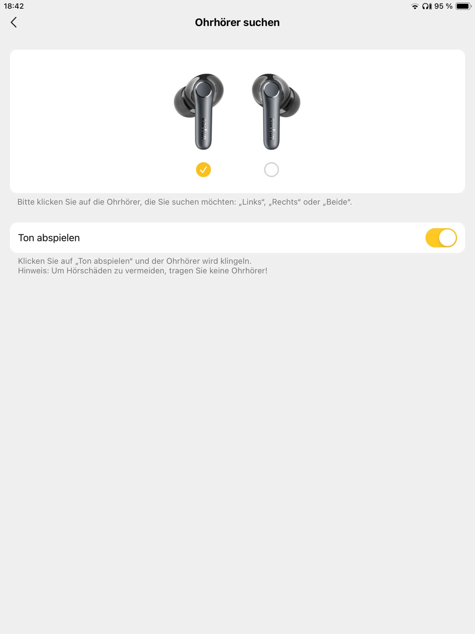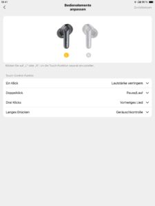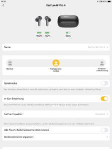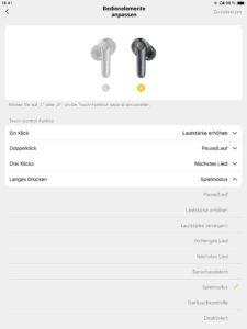Neben der Touch-Steuerung lassen sich die Sprachansagen und Mikrofoneinstellungen konfigurieren sowie Firmware-Aktualisierungen vornehmen. Auch der Gaming-Modus, die Trageerkennung und Multipoint-Verbindungen können nach Bedarf ein- oder ausgeschaltet werden, während eine Suchfunktion per Piepton das Auffinden der Hörer erleichtern soll.