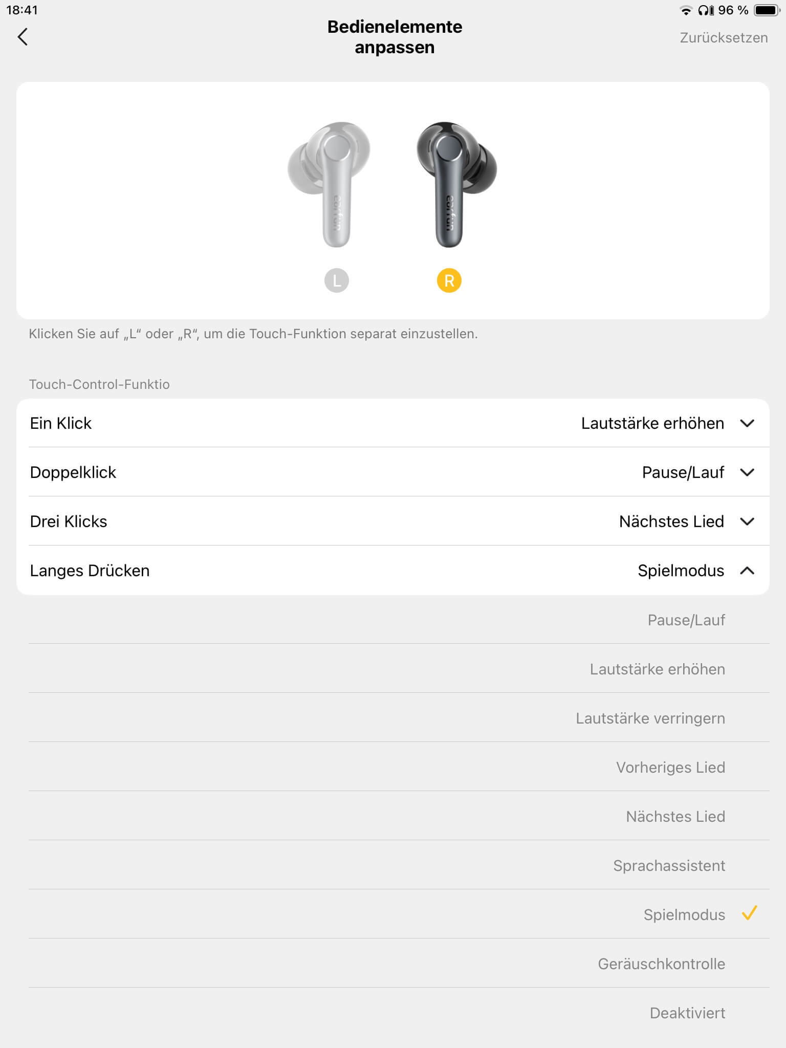 Wer möchte, hat zudem die Möglichkeit das (De-)Aktivieren des Gaming-Modus nachzurüsten, da sich die Touch-Steuerung über die App an die eigenen Vorlieben anpassen lässt. Vermisst werden kann dagegen das Ein- und Ausschalten der Hörer über die Touch-Oberflächen, wodurch das Case stets benötigt wird. Eine einseitige Nutzung im Single-Betrieb ist jedoch jederzeit möglich.