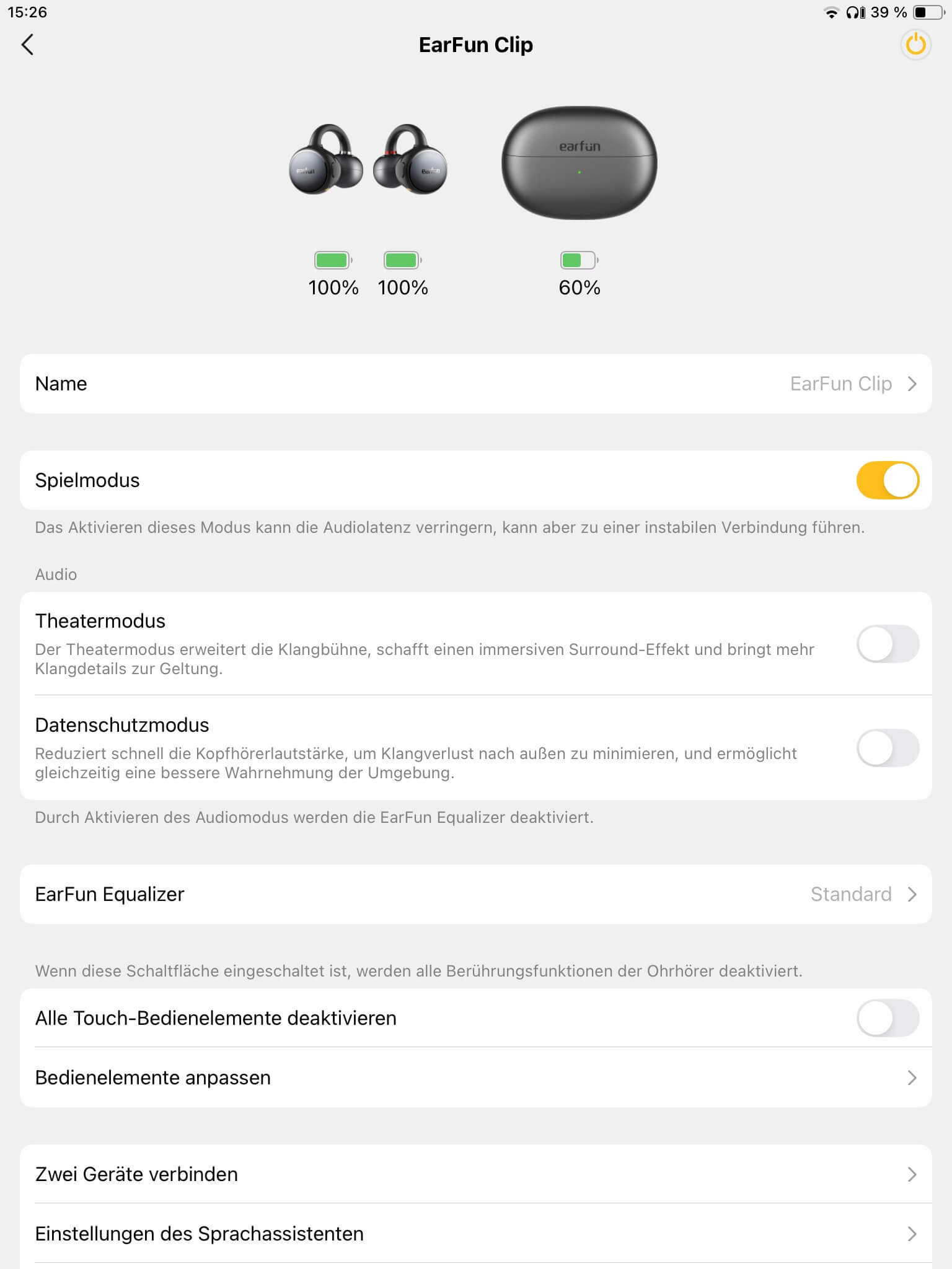Neben Bluetooth 6.0 unterstützen die EarFun Clip auch Google Fast Pair und Multipoint-Verbindungen mit zwei Geräten gleichzeitig. Darüber hinaus umfasst die Auswahl an Audiocodecs SBC, AAC und LDAC. Ein latenzarmer Gaming-Modus für Computer- und Handy-Spiele sowie Video-Clips und Filme zählt ebenfalls zur Ausstattung. Dabei wirkte die Funkverbindung während der Testphase relativ stabil, sodass im Innenbereich mehrere Räume auf zwei Etagen genutzt werden konnten. Im Freien waren ab etwa 20 Metern erste Aussetzer erkennbar.