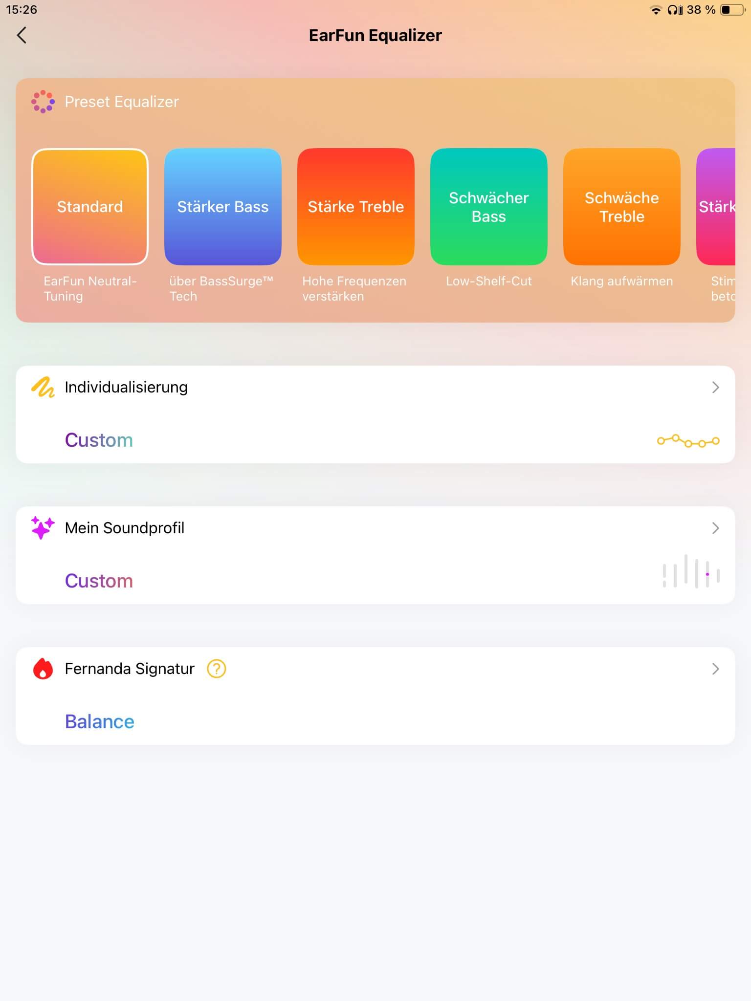 Zur Klangregelung der EarFun Clip stehen über die App-Anbindung (Android und iOS) sechs Voreinstellungen zum Anheben oder Absenken von Bässen, Mitten und Höhen plus 15 Settings für diverse Musikrichtungen von Hip-Hop bis Klassik zur Auswahl. Eigene Einstellungen können darüber hinaus über einen 10-Band-EQ vorgenommen werden, die als Presets speicherbar sind. Ergänzt wird das umfangreiche Angebot noch um eine Signature-Abstimmung von Fernanda (technikbegeisterter Produzent), die sich auch als Ausgangsbasis für eigene Anpassungen nutzen lässt. Außerdem besteht die Option, ein persönliches Soundprofil zu erstellen, was allerdings sehr basslastige Ergebnisse hervorbringt und übersteuert, weshalb vom Einsatz abzuraten ist.