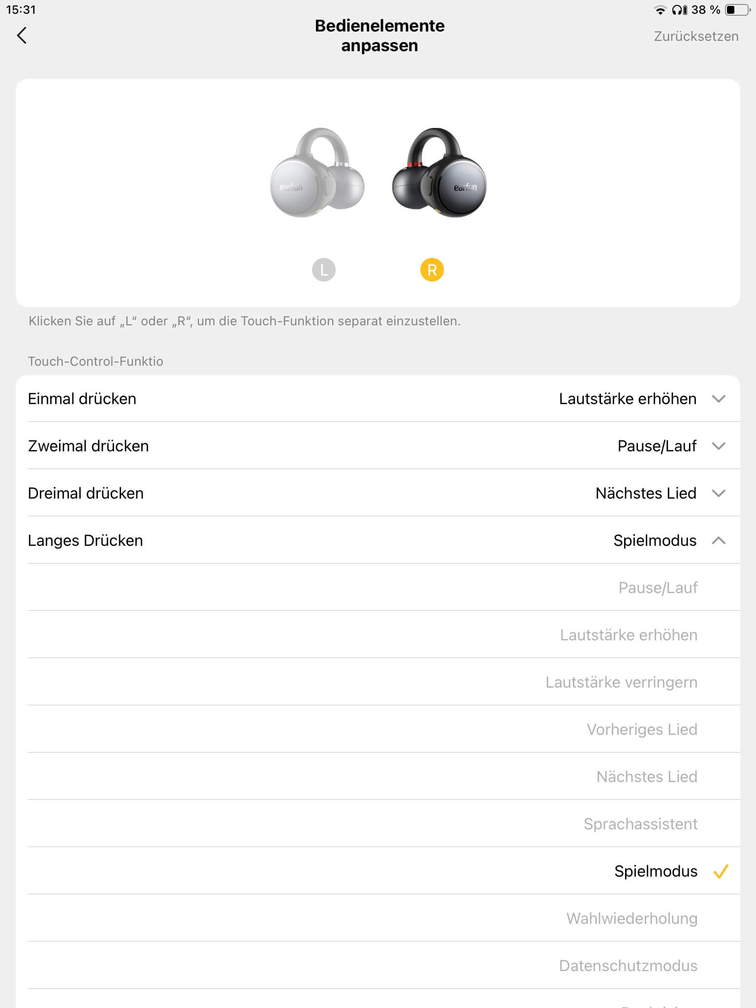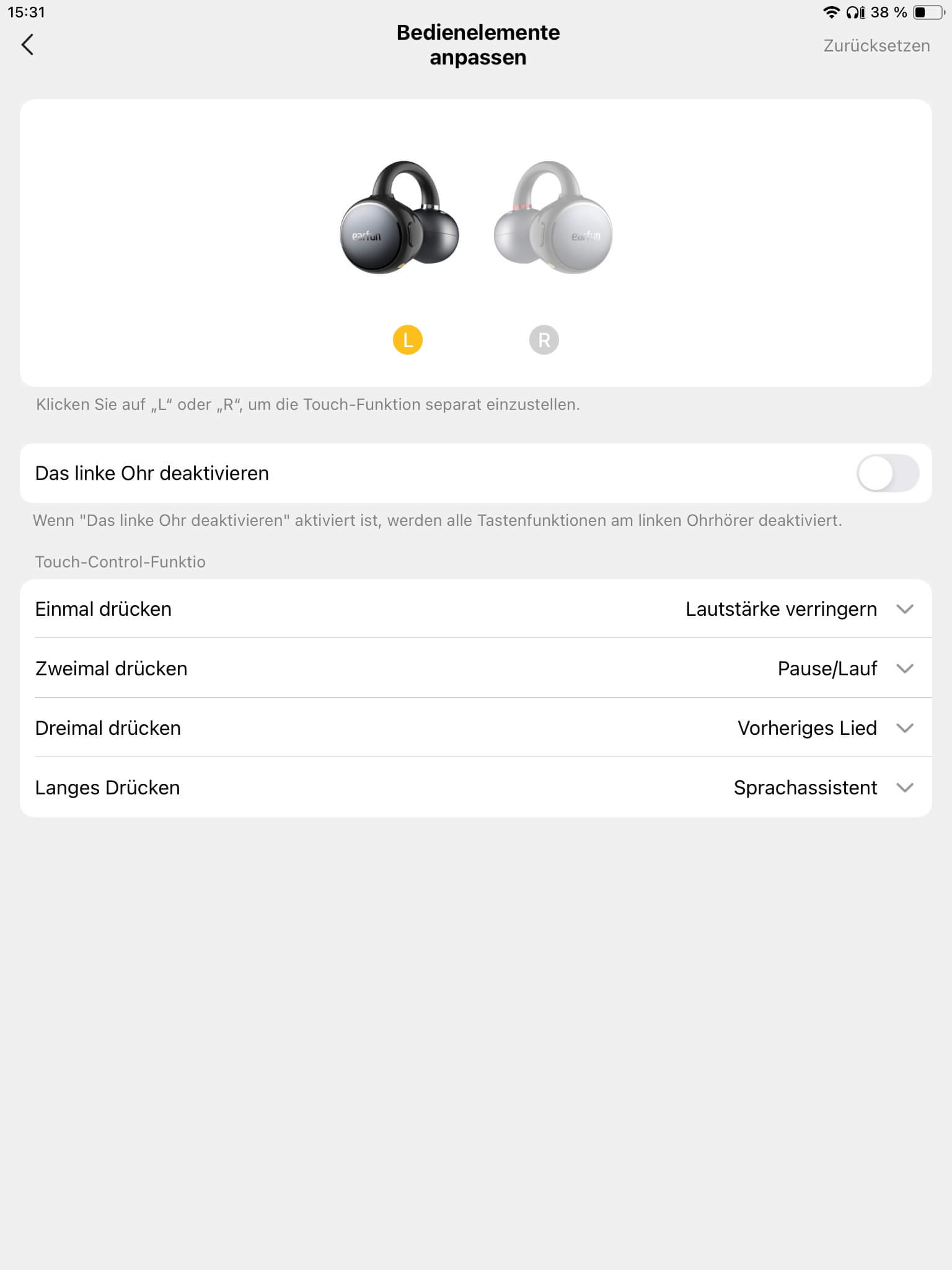 Nicht vorgesehen ist dagegen ein manuelles Ein- oder Ausschalten der Hörer, wodurch das Case stets benötigt wird. Verzichtet wurde zudem auf eine Trageerkennung und eine automatische Kanalanpassung, allerdings sind linker und rechter Hörer farblich durch einen Ring gekennzeichnet, was die Zuordnung vereinfacht.